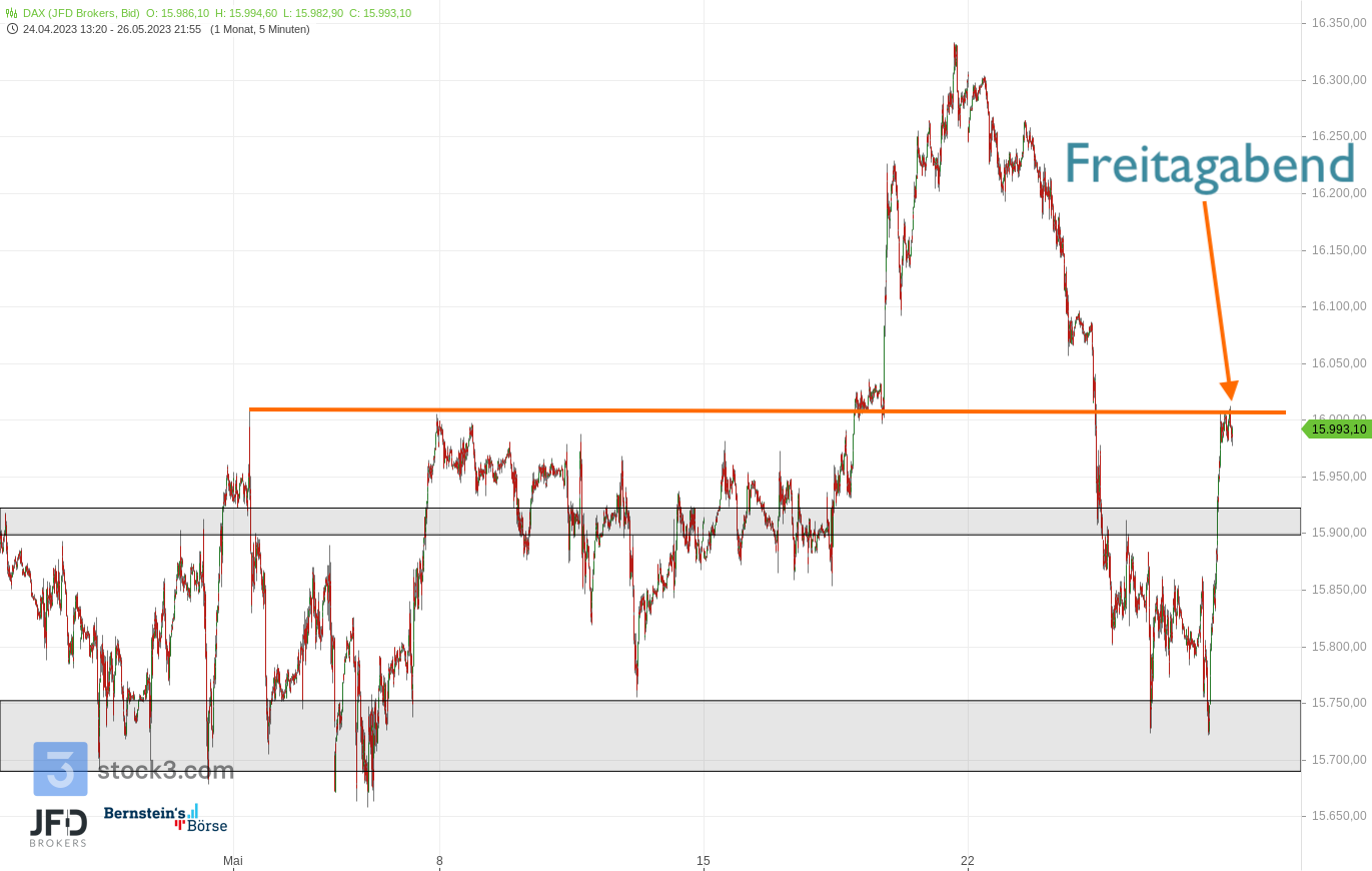 Ziel auf der Oberseite könnte damit erneut die 16.000 oder genauer die 16.010 sein, an der wir am Freitagabend angelangte.