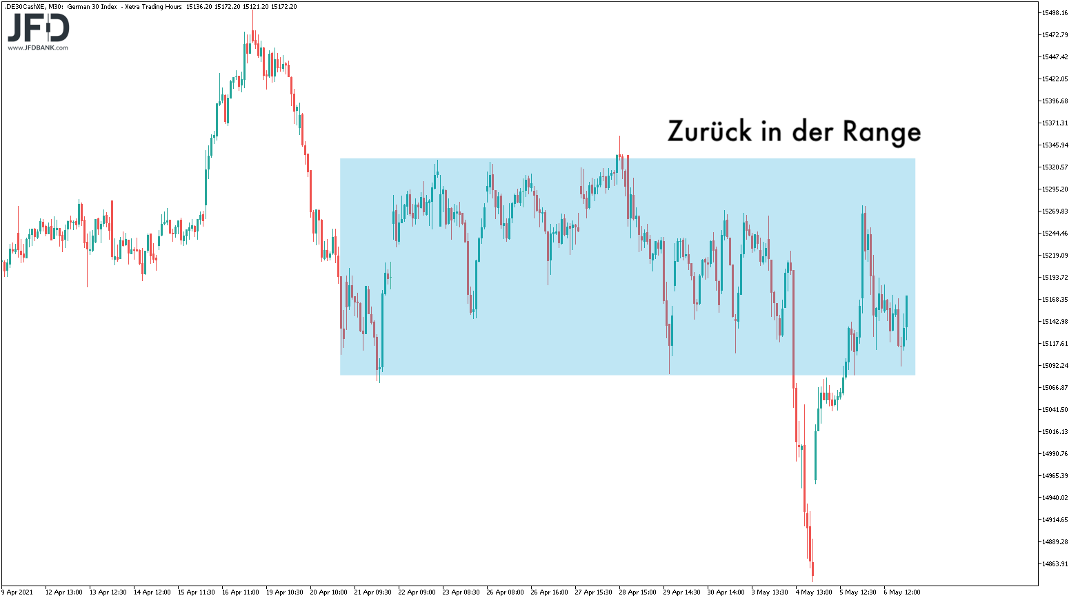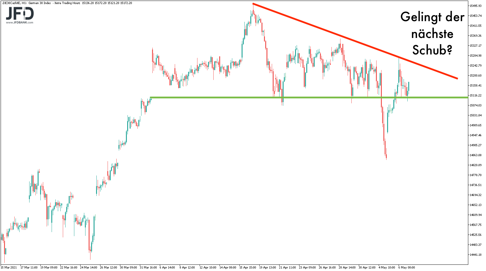 Dort traf der Index auf die Abwärtstrendlinie, beginnend vom Rekordhoch. Ein Rücksetzer folgte, der noch einmal die untere Range-Kante zurück in den Fokus der Anleger brachte. Diese hielt nach Eröffnung der Wall Street und diente letztlich als Ausgangspunkt für einen neuen Anlauf zur Range-Oberseite.