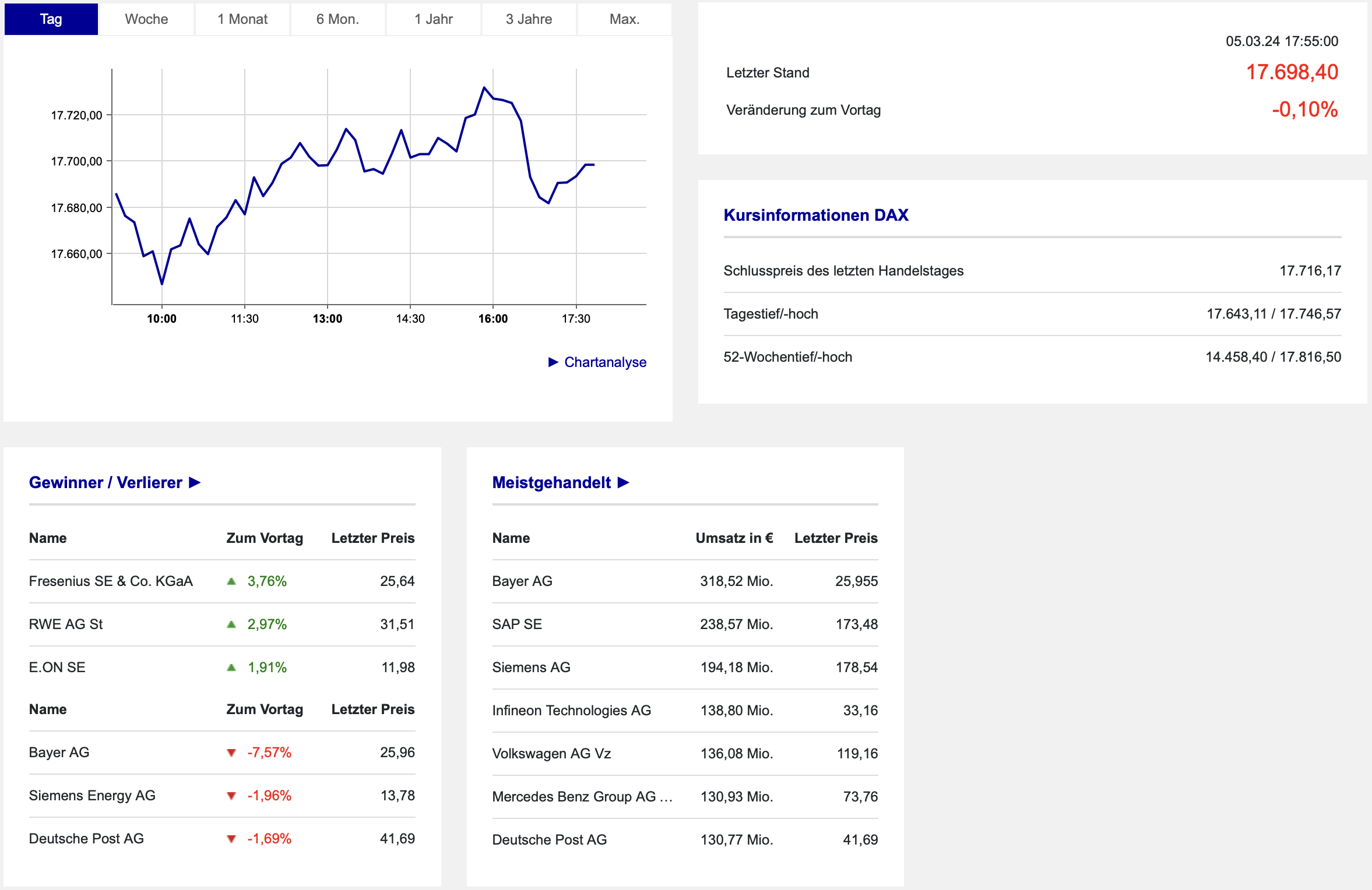 Auch wenn es noch einmal tiefere Kurse vor Handelsschluss gab, die sich vor allem mit den Rückläufen an der Wall Street erklären ließen, hielt sich der DAX sehr gut. Nur ein minimales Minus war das Tagesfazit, welches sich anhand der Daten der Börse Frankfurt noch einmal im Detail ansehen lässt: