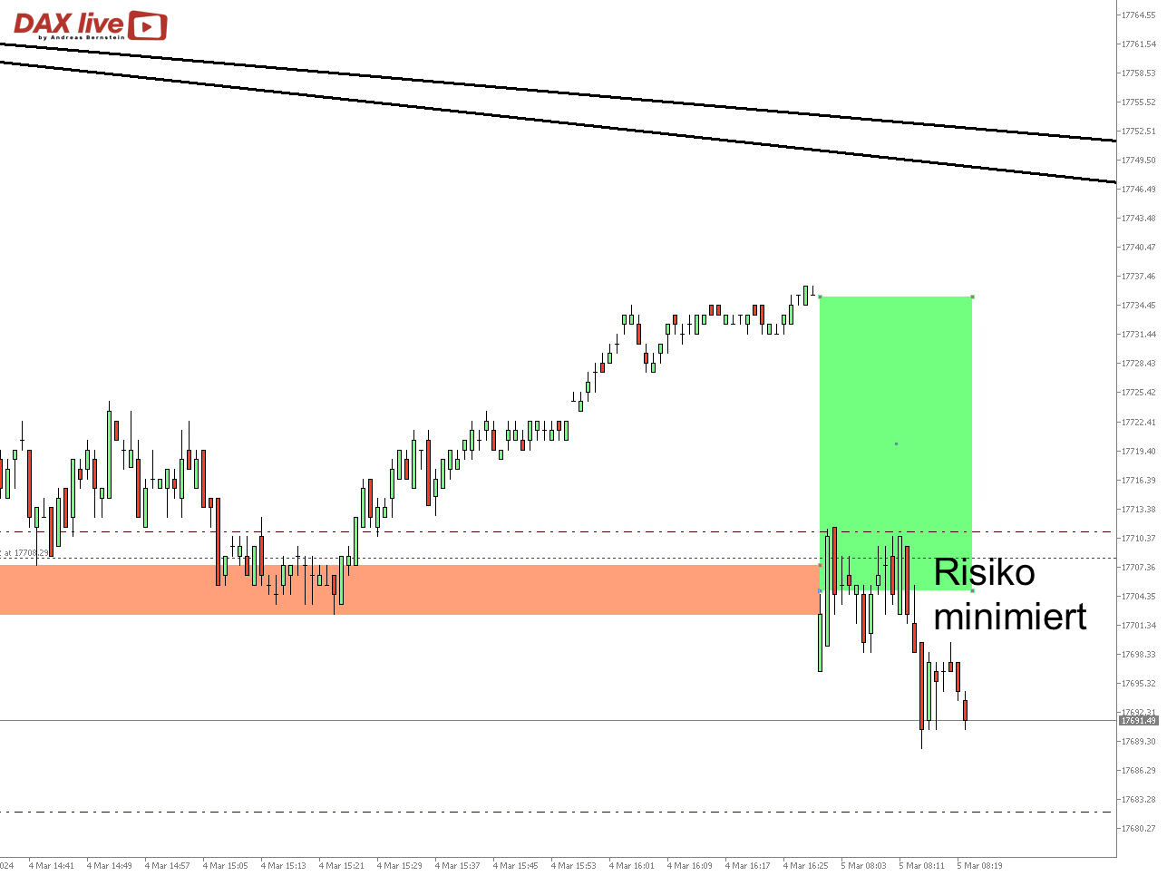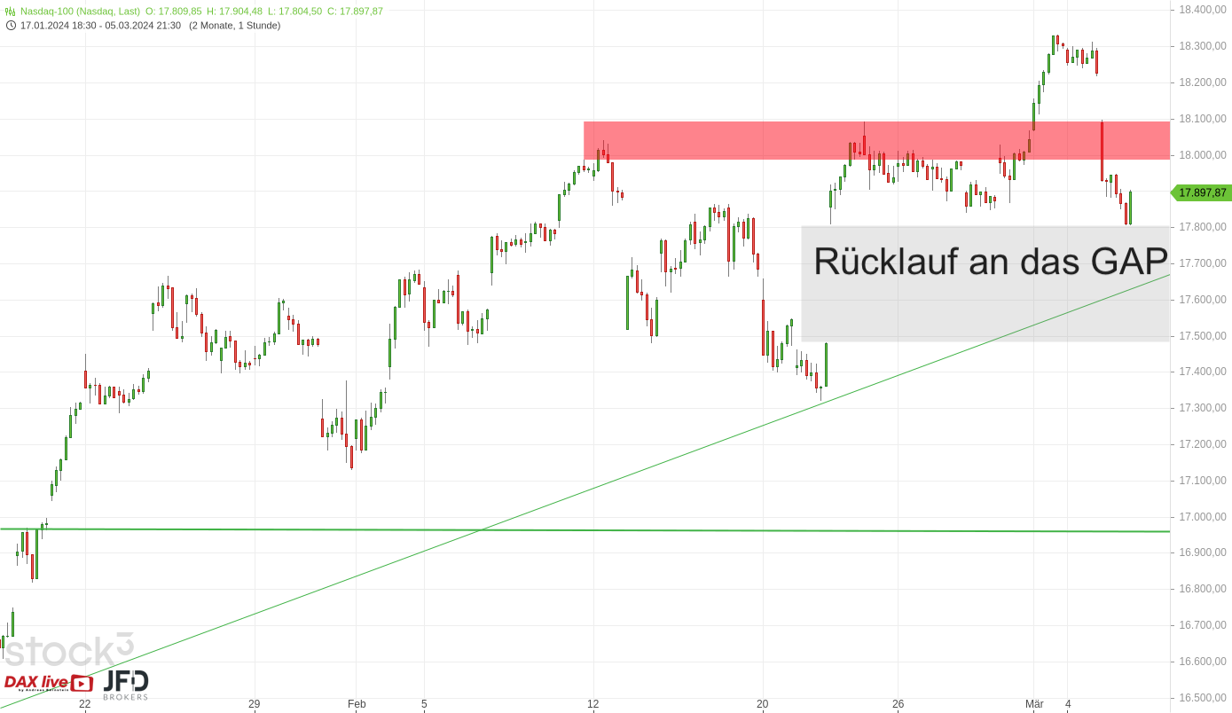Der Index stabilisierte sich bis zum Mittag dann deutlich und kehrte zur 17.700 und damit in die grüne GAP-Zone zurück, die er am frühen Nachmittag schloss. Damit war auch der Abwärtstrend gebrochen, den wir ab dem Allzeithoch am Freitag einzeichnen konnten: