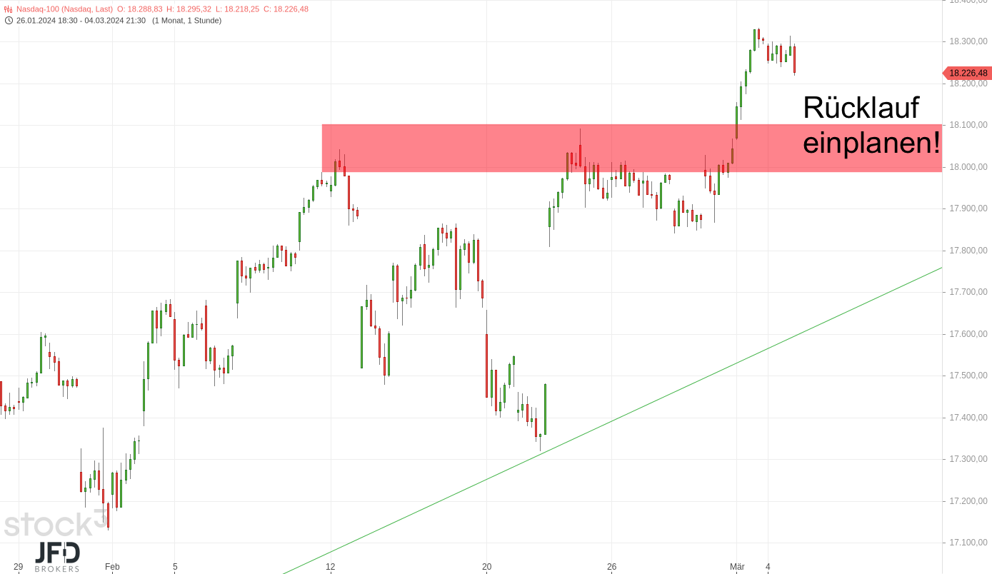 Gestern sprachen wir in der Morgenanalyse über das Szenario, dass der Nasdaq das Ausbruchslevel um 18.000 testen könnte. Hierzu noch einmal das Erinnerungsbild: