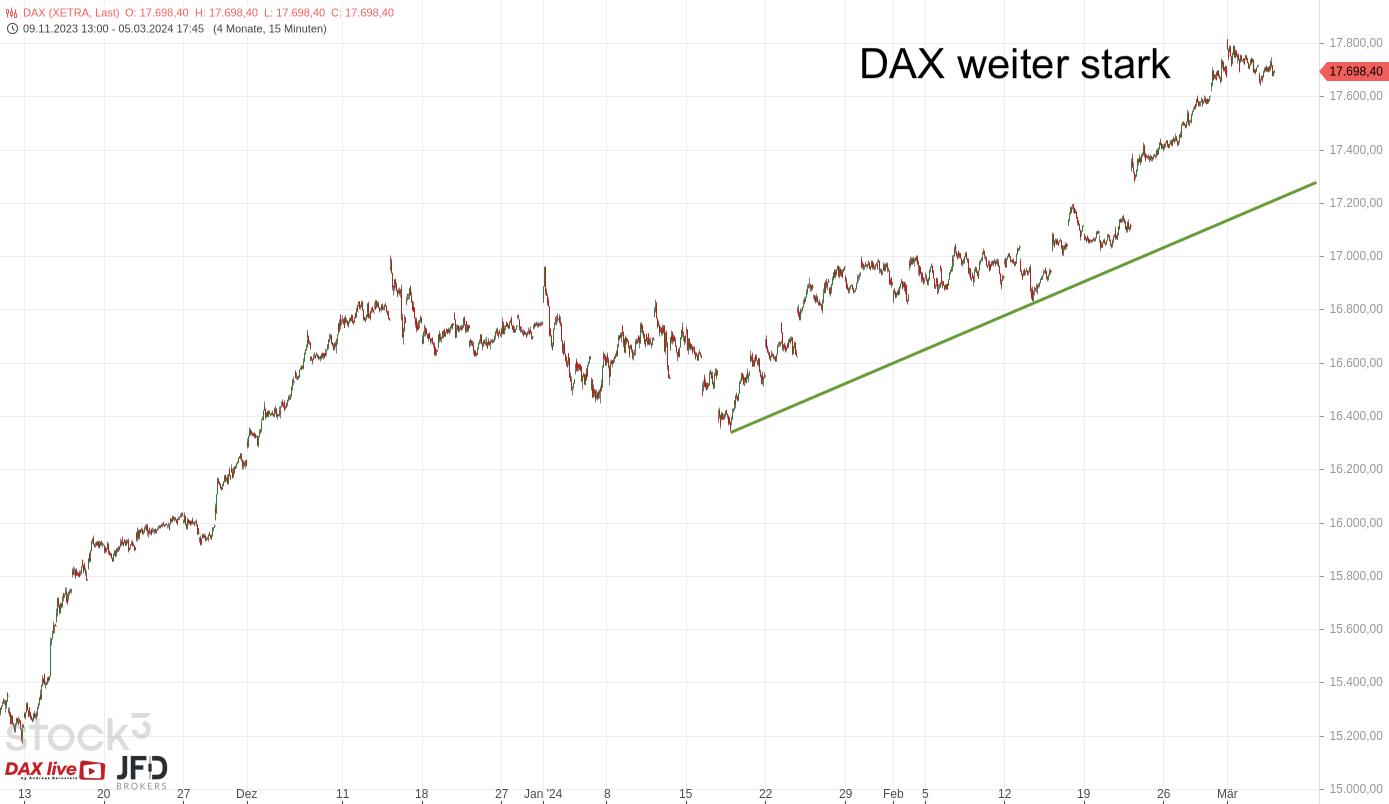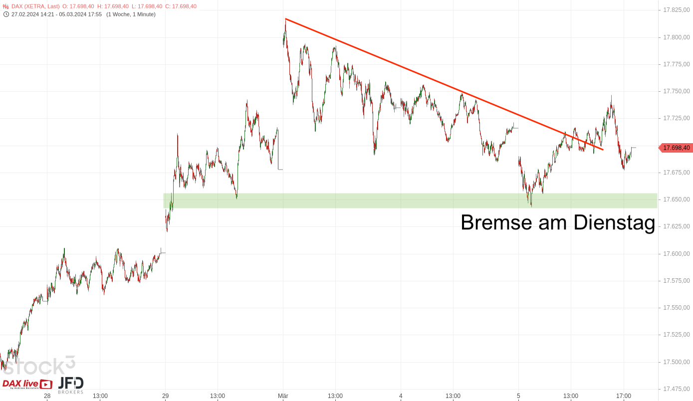 Nach der Rekordlaune im DAX stand nun eine zumindest kleine Konsolidierung an. Zum Wochenstart gab es bereits einen Rücklauf, der für den Dienstag die Aufwärtstrendlinie der letzten Wochen zurück auf die Agenda brachte. Ich stellte diese in der Morgenanalyse am 05.03.2024 bei rund 17650 Punkten wie folgt dar (Rückblick):