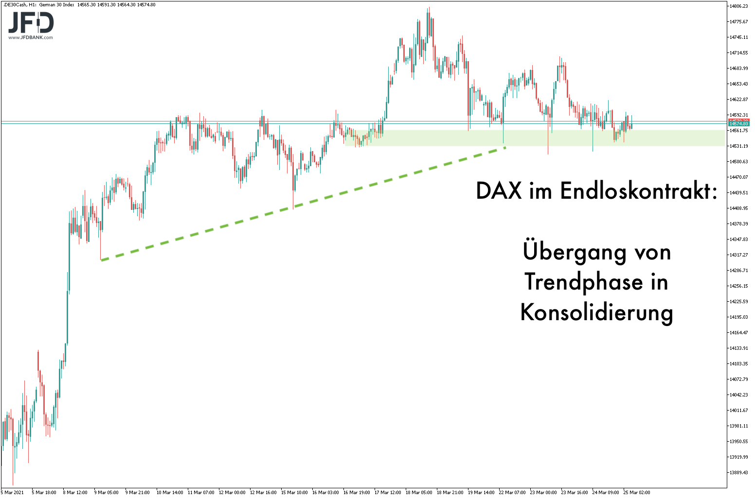Mit der fallenden Volatilität steigt die Chance auf eine größere Bewegung. Es ist förmlich zu spüren, wie die Marktteilnehmer auf eine Entscheidung an der 14.600 warten. Doch dabei gilt es, ein Signal abzuwarten.
