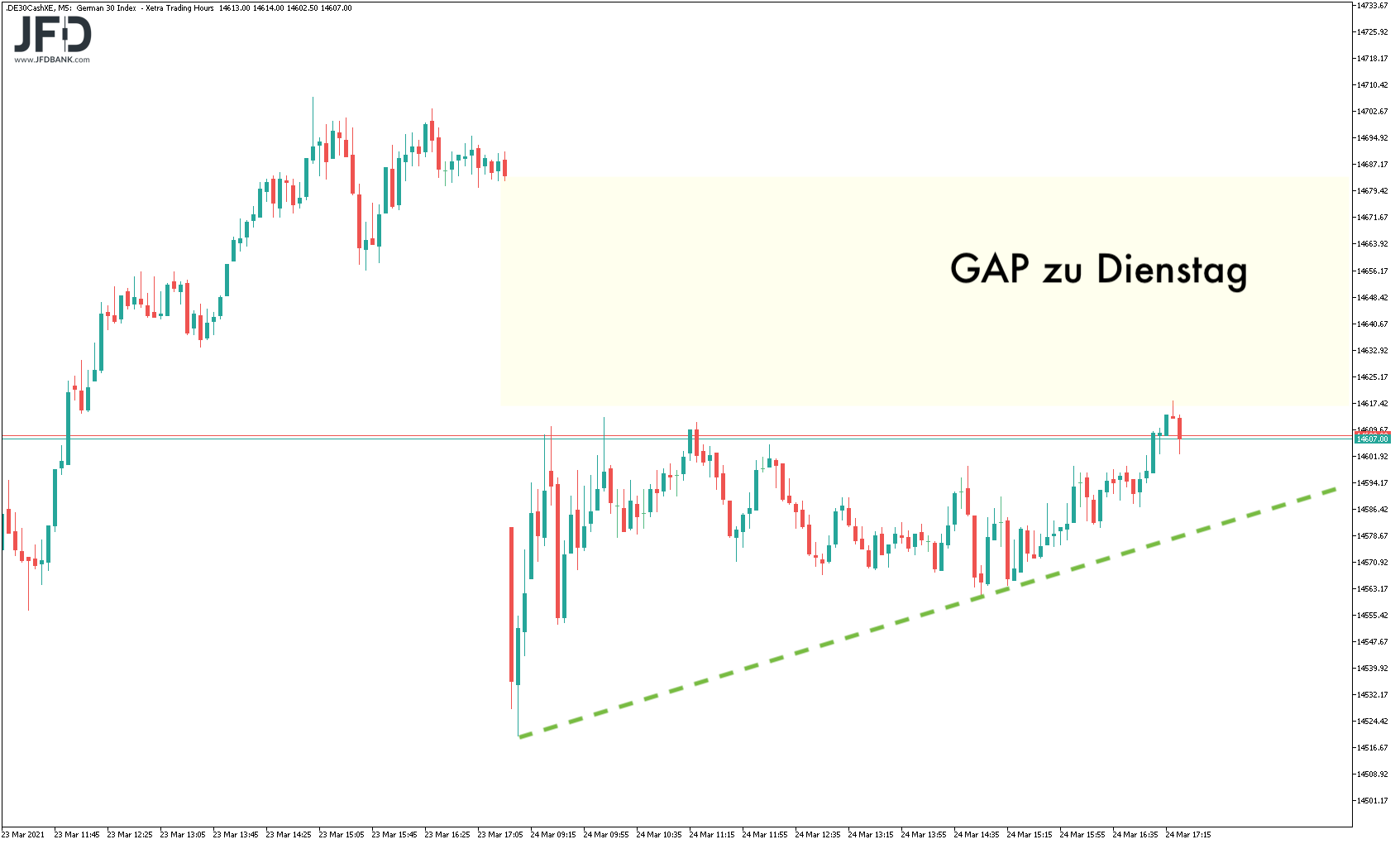 Mit dem Erreichen der 14.600 am Nachmittag schien der DAX zumindest das Level gerettet zu haben, aber keinen weiteren Impuls setzen zu wollen. Die Kurslücke zum Dienstag blieb geöffnet:
