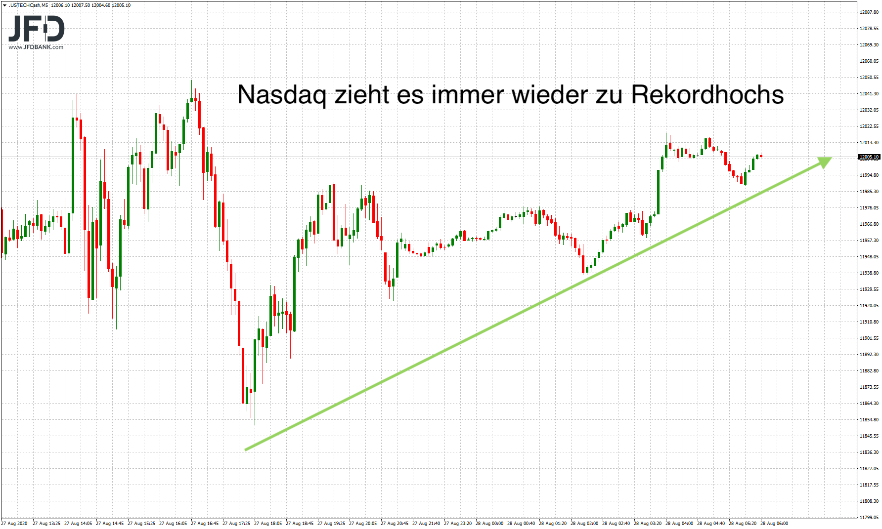 Der Markt interpretierte hier wenig, denn im Fokus stand das Treffen der Notenbänker in Jackson Hole. Dort hielt (bzw. über Stream bei dieser Veranstaltung) FED-Chef Jerome Powell eine Rede und sprach sich für eine kurzzeitige Erweiterung des Inflationsziels von 2 Prozent in den USA aus. Das erfreute den Aktienmarkt, so dass die Wall Street sehr positiv in den Tag startete und der Nasdaq mit über 12.000 Punkten einen neuen Meilenstein auf dem Weg von Rekordhoch zu Rekordhoch erreichte.