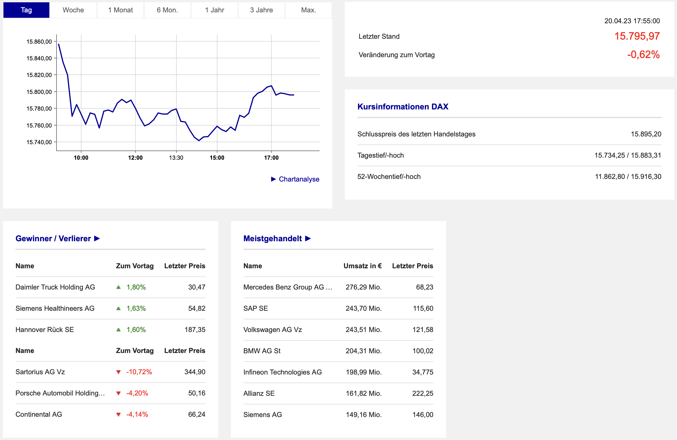 Damit schloss der Donnerstag letztlich doch noch mit einem Minus, aber markierte keinen weiteren Rutsch oder gar einen panikartigen Verkauf. Du siehst die exakten Daten der Börse Frankfurt hier als Abbild: