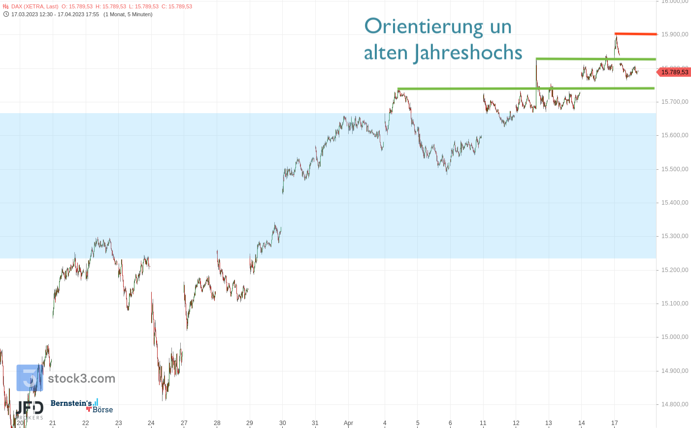 Der DAX steckt zum Wochenausklang weiter in einer Konsolidierungsphase. Es gab zwar im Wochenverlauf neue Jahreshochs über 15.900 Punkte, doch letztlich bewegt sich der Index in den Bandbreiten, die wir schon in der Dienstagsanalyse am 18.04.2023 wie folgt darstellten (Rückblick):