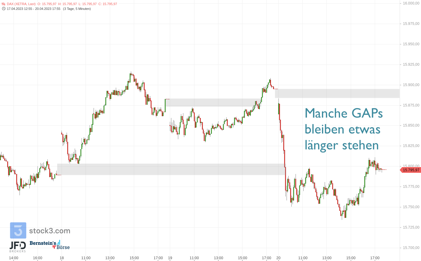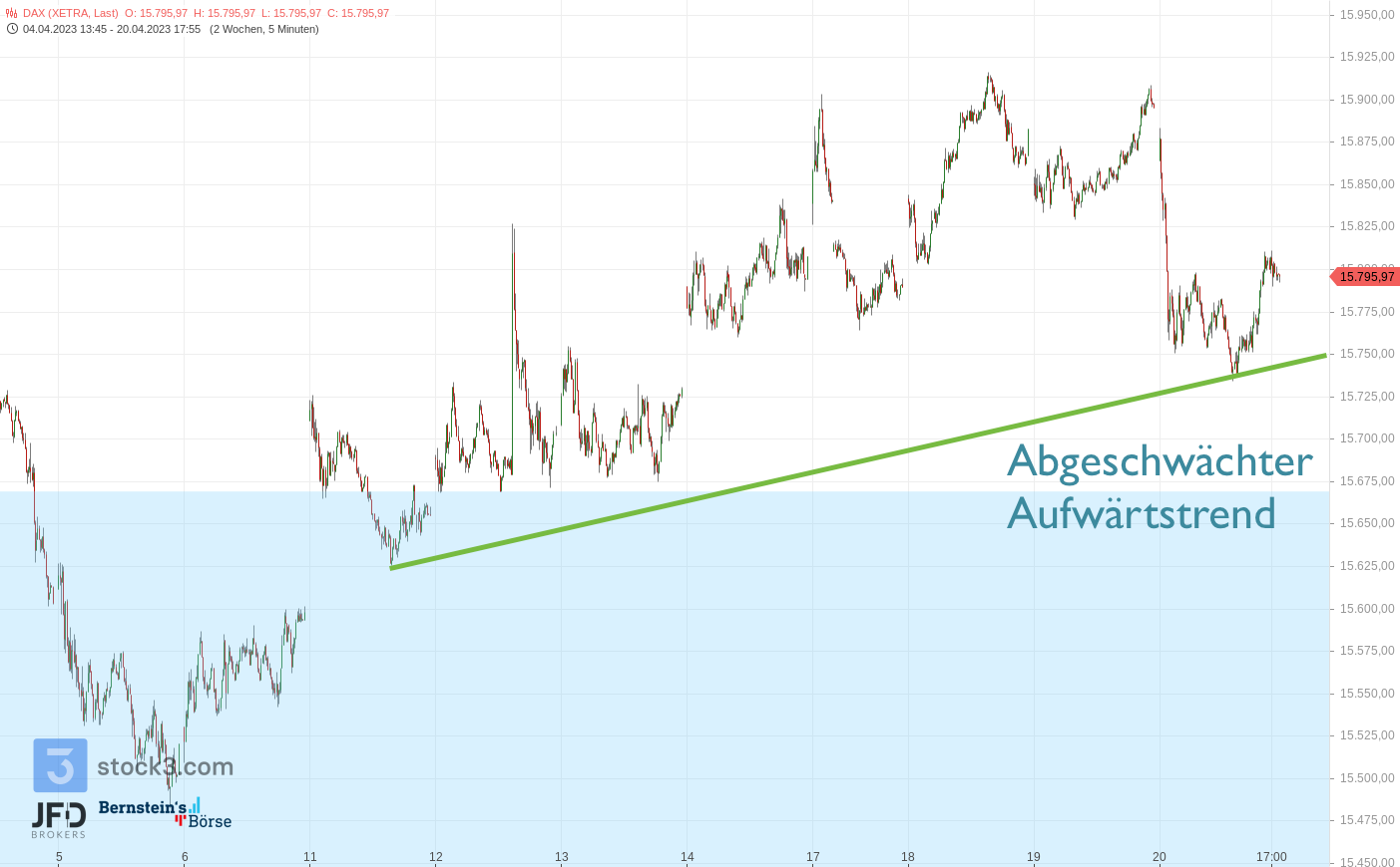 Blicken wir auf die große Zeiteinheit zurück, ist der gestrige Bereich der Tagestiefs bereits vor genau einer Woche eine Unterstützung gewesen. Hält diese, sind die Chancen für eine Fortsetzung der (wenn auch gebremsten) Aufwärtsbewegung weiter gegeben. Unter 15.750 könnte jedoch jederzeit der Markt neue Verlaufstiefs ausbilden und die große Range aus dem Februar dann auch schnell angelaufen werden.
