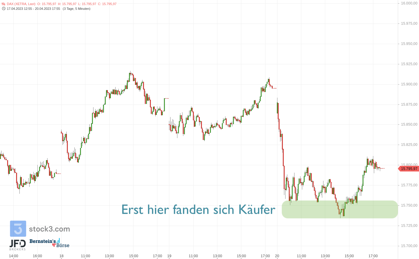 Nach zwei aufeinander folgenden Hochs am Dienstag und Mittwoch über 15.900 Punkten kam es dann am Donnerstag zu einer tieferen Konsolidierung. Bereits zum Handelsstart gaben die Kurse etwas nach und fingen sich diesmal nicht direkt nach ersten Abgaben, sondern drangen tiefer in den Handelsbereich der Woche ein. Erst im Bereich um 15.750 Punkte konnte ein Intraday-Boden ausgebildet werden, der dann am Nachmittag noch einmal den Rebound zur 15.800 vollzog:
