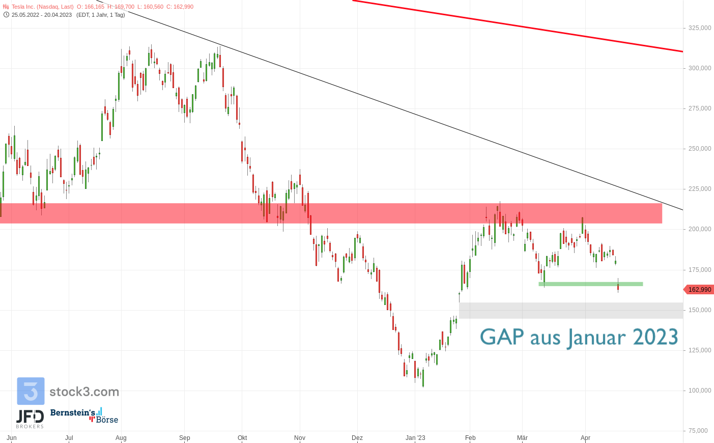 Am Tesla-Kurs selbst war gestern ebenfalls kein Aufholen der Verluste zu sehen, sondern ein Bruch des Monatstiefs per Schlusskurs. Dies würde nun technisch den Weg zu dem großen GAP vom Jahresstart aus Januar freilegen: