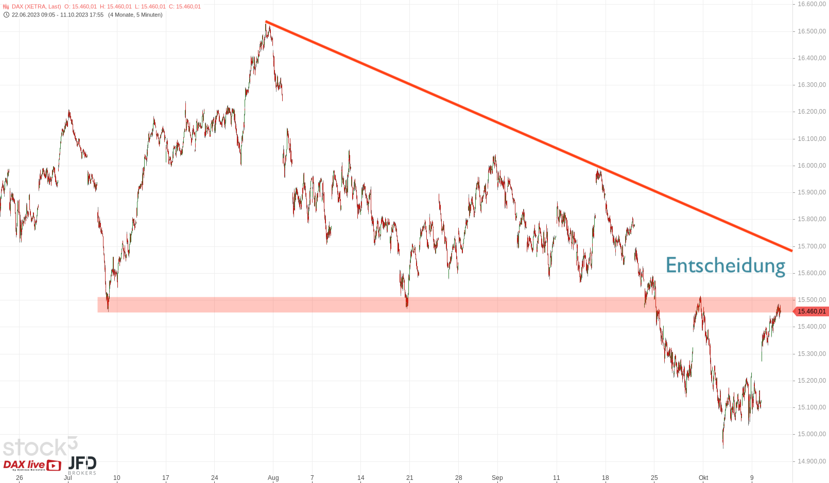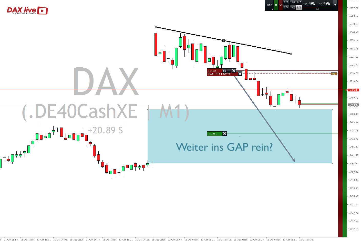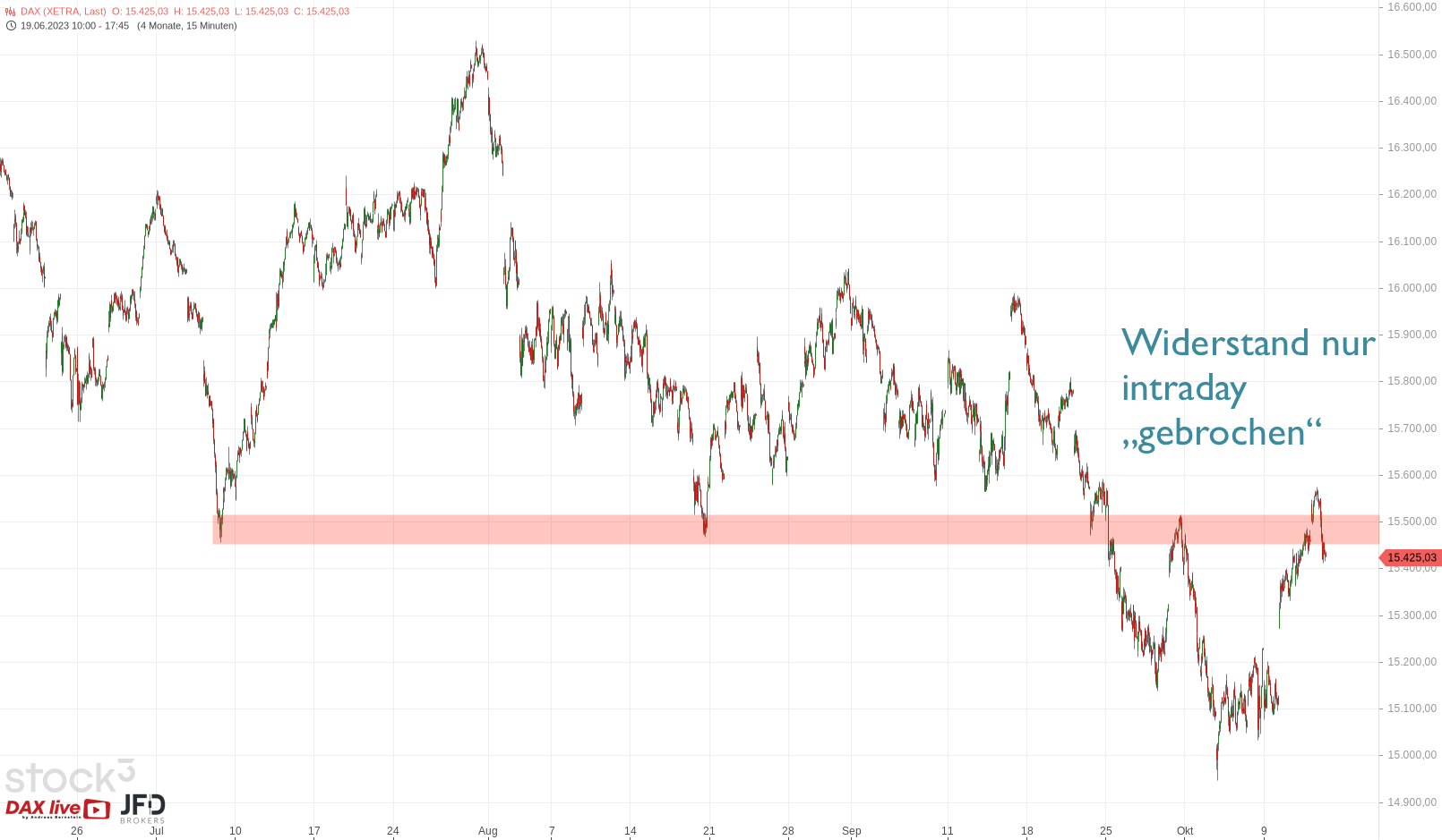 Das Anlaufen der großen Abwärtstrendlinie am gestrigen Tag um 15.330 Punkte war dann für mich ein Short-Trigger, der mehrfach gehandelt werden konnte: