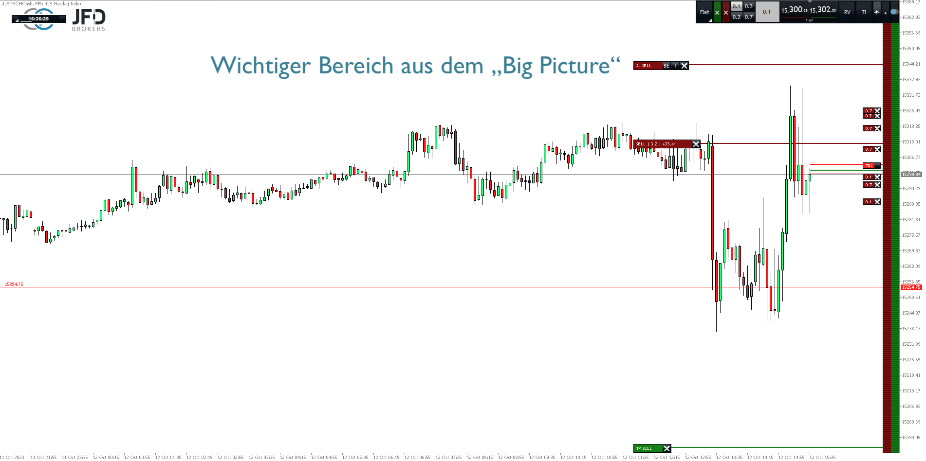 Den große Widerstandsbereich im "Big Picture" beschäftigte uns im Trading seit einigen Wochen. Zum Mittwochabend kamen wir dem Bereich sehr nah und waren damit in der Morgenanalyse am 12.10.2023 gespannt, ob dieser Bereich dann auch bricht (Rückblick):