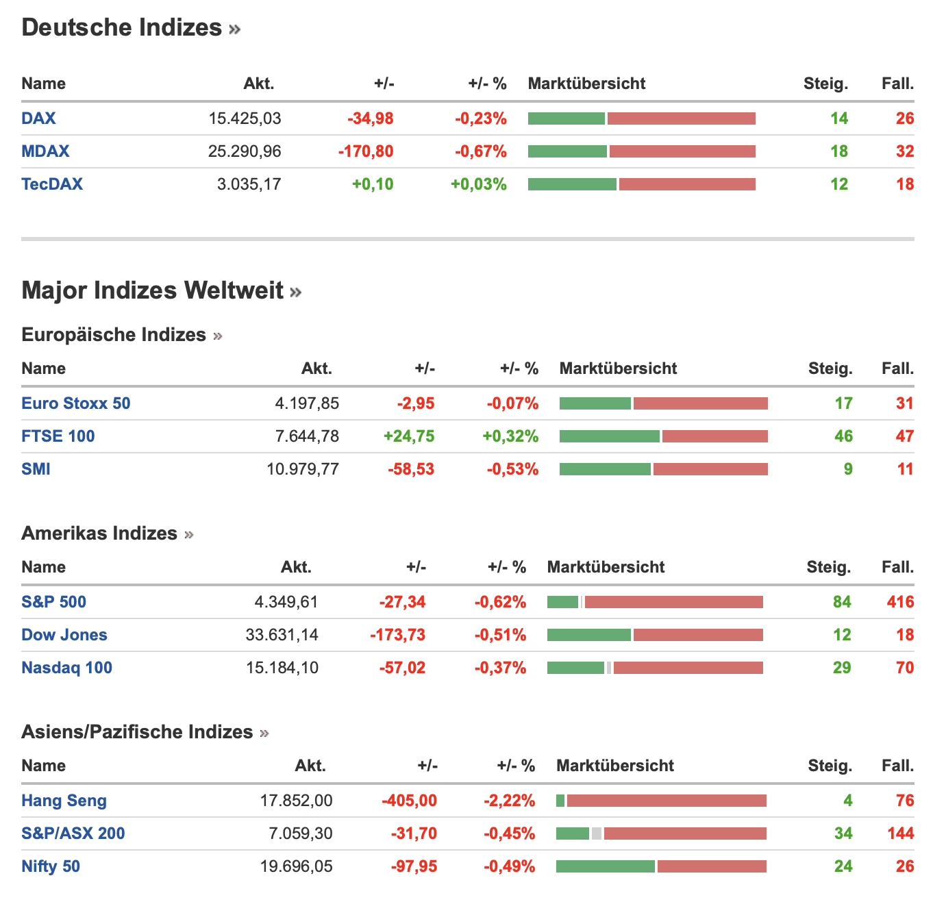 Der Tag endete demnach nicht nur in Europa, sondern auch in Amerika im Minus. Die Übersicht heute zeigt auch schwache Märkte in Asien: