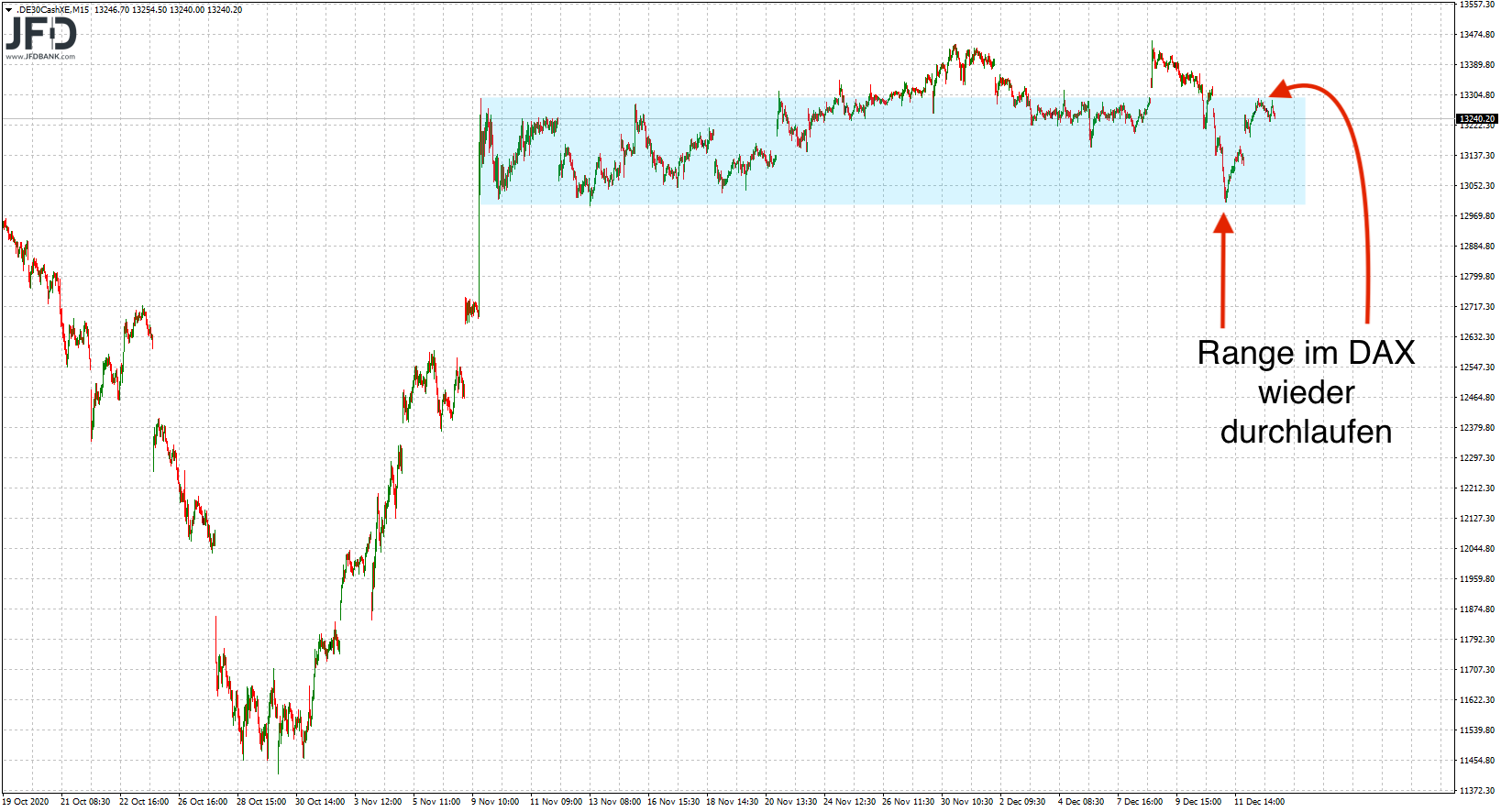 In der Ausdehnung konnte der DAX bis zum Mittag dann mit 13.292 Punkten sehr genau die Range-Oberkante der letzten Wochen anlaufen. Ein Level, was danach wieder zu Korrekturbedarf führte und zum Handelsende hin den Markt somit weiter in der Range fesselte: