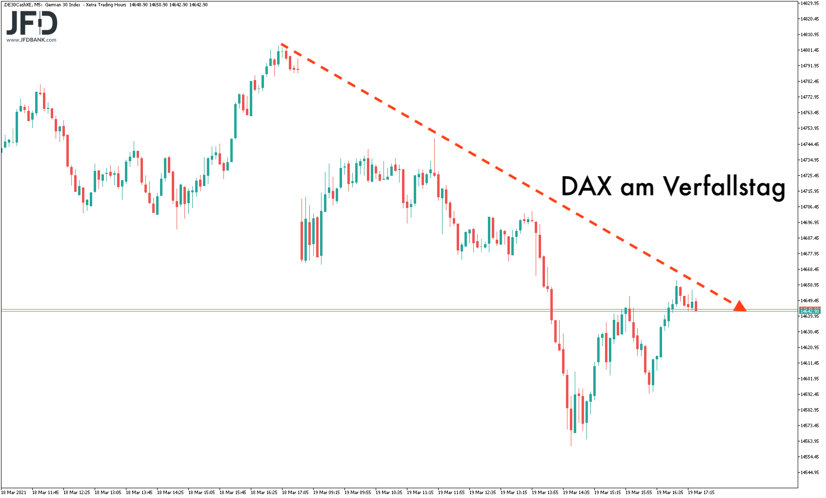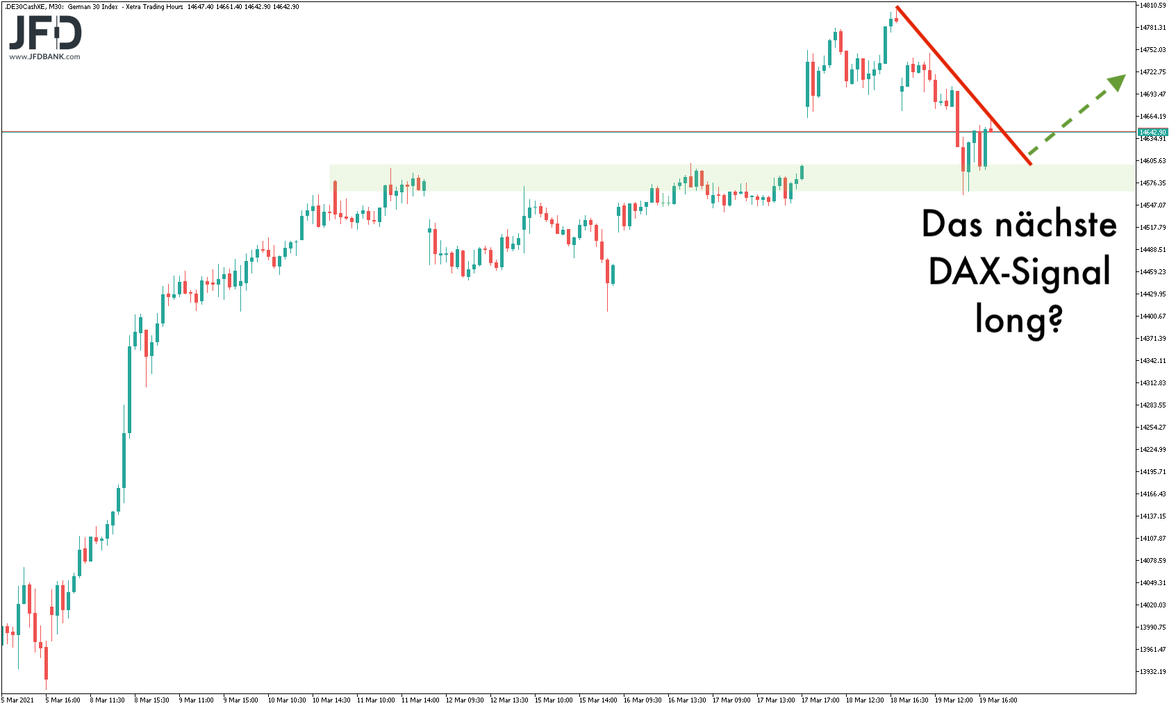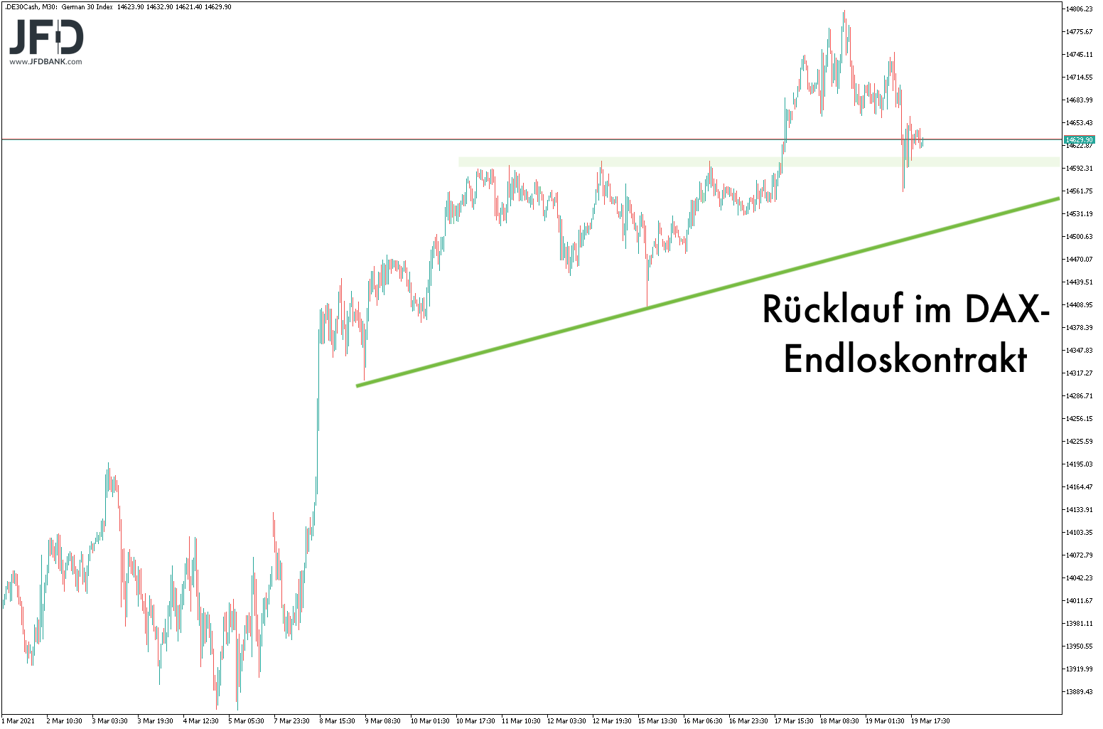 Damit ist zum Wochenstart die 14.600 eine Art Schlüsselmarke. Hier verweilte der DAX nach dem Schließen der Kurslücke zum FED-Tag (Mittwoch) und trifft direkt auf den aktuellen Abwärtstrend, welchen man ausgehend vom Rekordhoch einziehen kann: