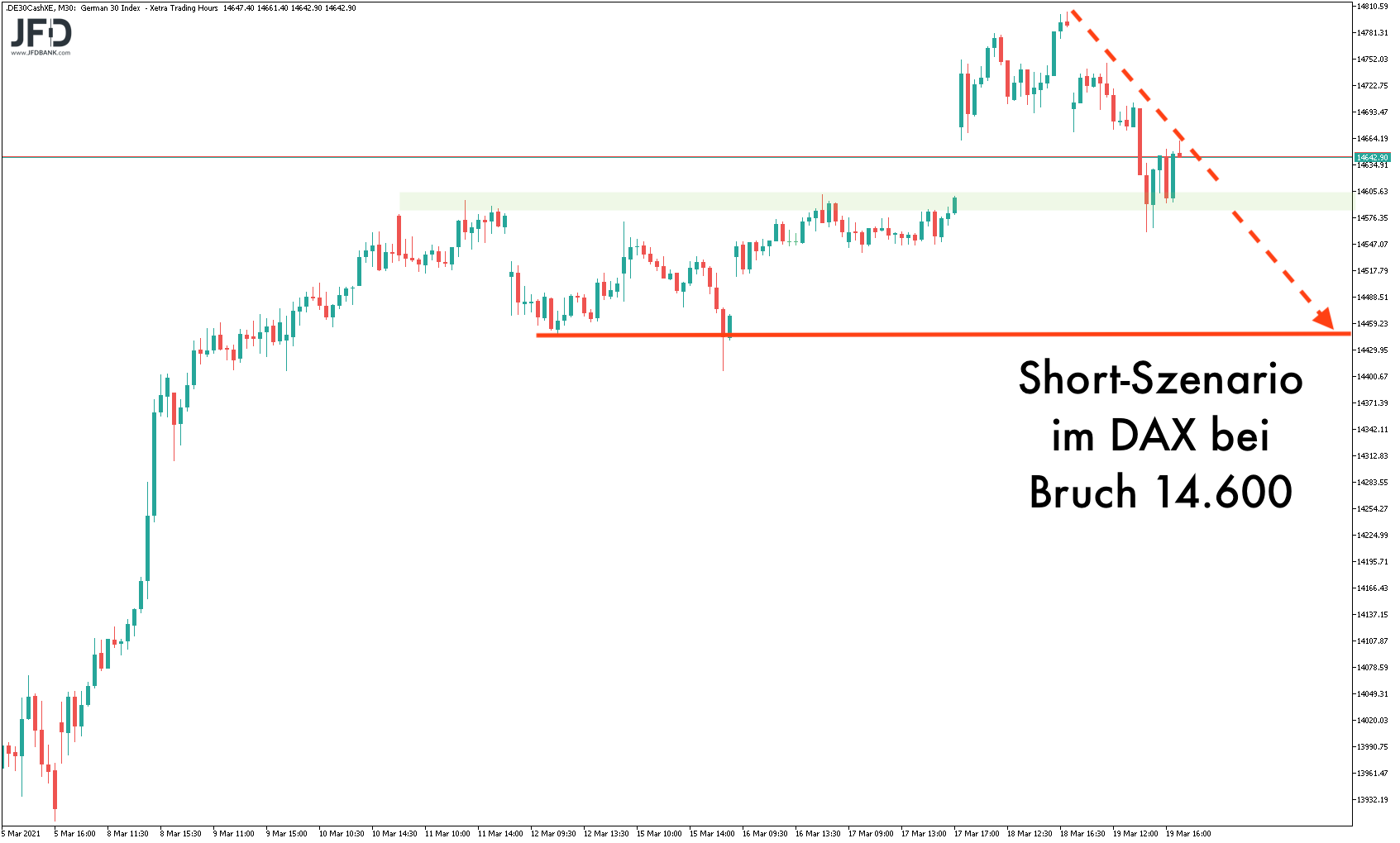 Unterstellt man eine Fortsetzung dieser Korrekturbewegung, würde direkt die 14.460, respektive das Korrekturtief bei genau 14.409 Punkten, als Ziel im Markt sichtbar werden:
