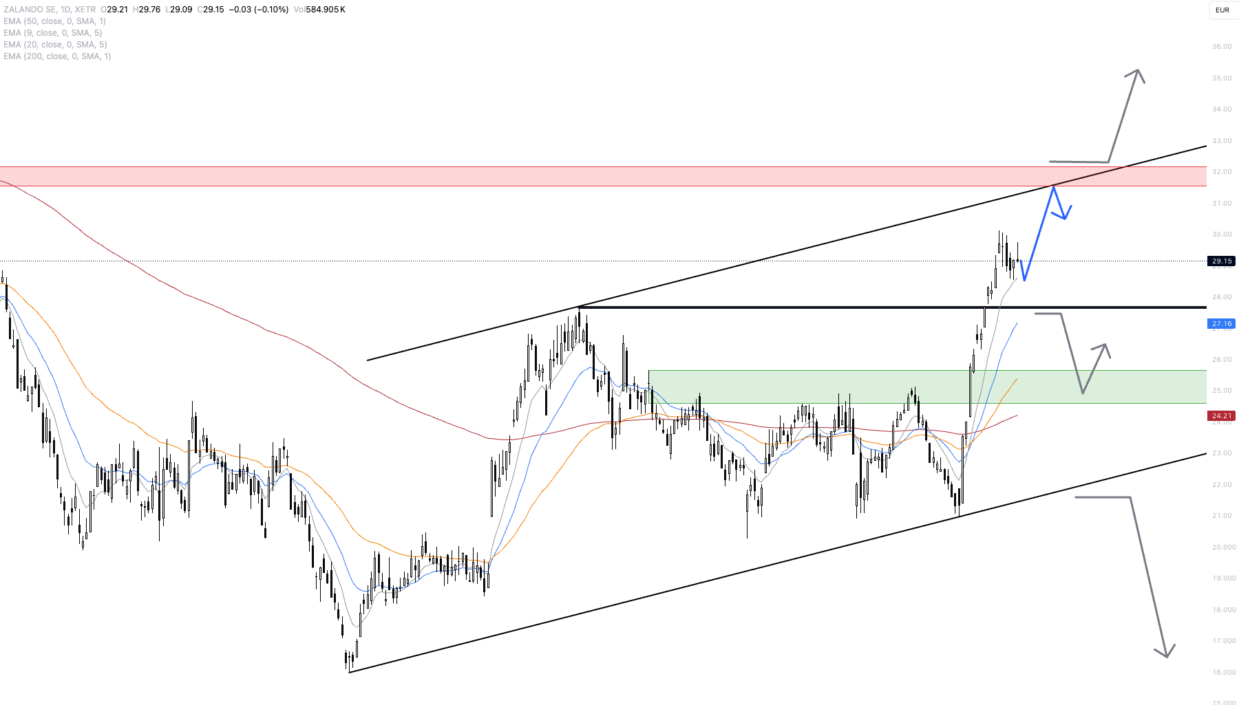 Seit einigen Tagen konsolidiert die Aktie auf hohem Niveau. In unserem Hauptszenario gehen wir von einem relativ direkten weiteren Anstieg bis in den großen Widerstandsbereich von 31 – 32 Euro aus. Dies würde weiteren 9 % Potenzial entsprechen.
