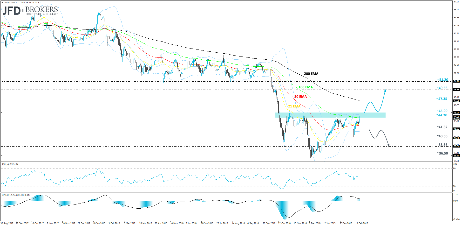 Alternatively, if the stock reverses lower and drops below the 41.82 hurdle, marked by the low of February 8th, this might raise concerns over the stock’s potential to travel higher. We would then examine the possibility of seeing AIG sliding to the 40.00 barrier, a break of which could drag the price towards the 38.36 obstacle, which is the low of the last day of 2018.