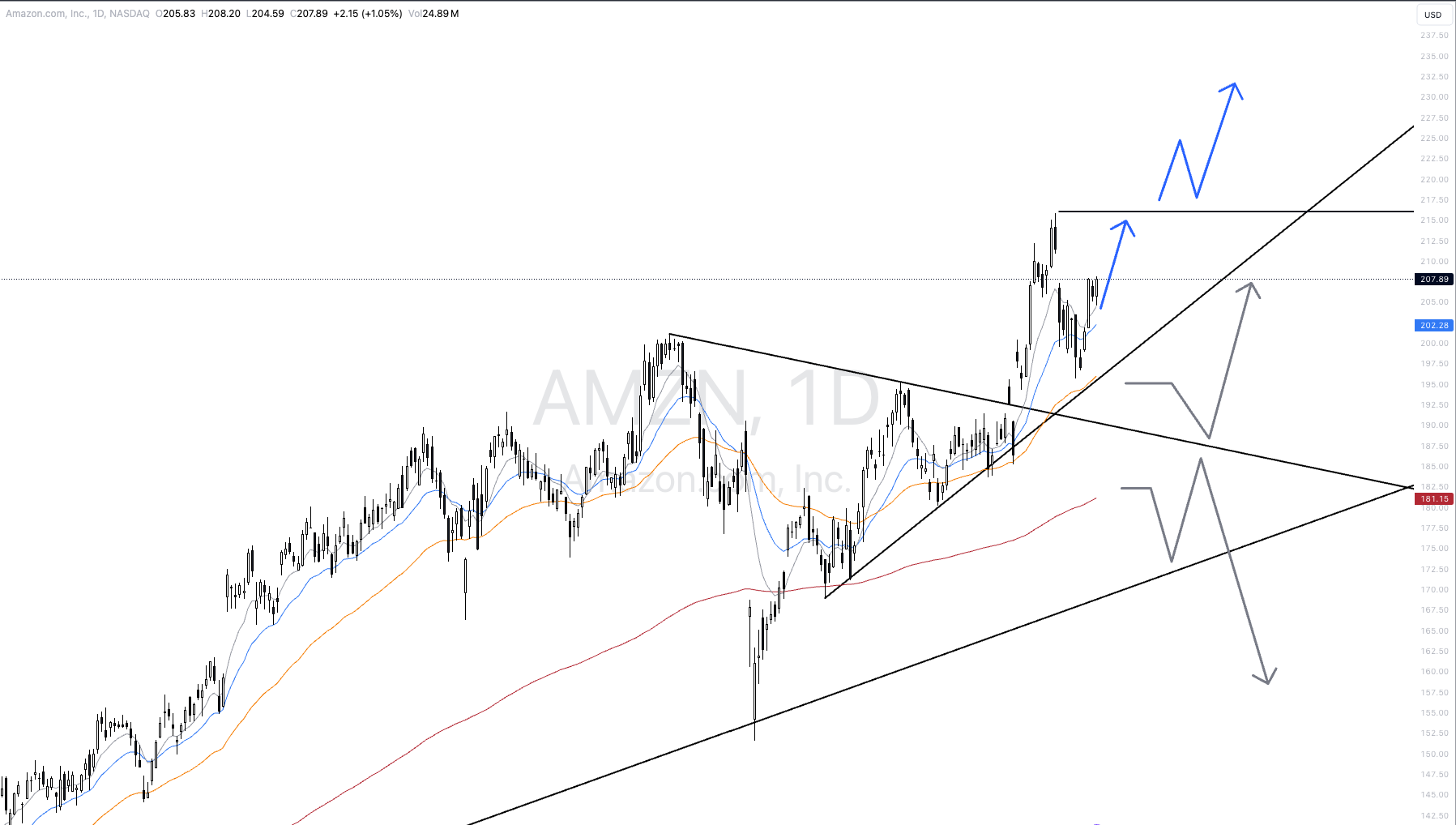 The stock reached new all-time highs in line with the last main scenario and, with the sustained break of USD 200, has unlocked new potential up to USD 250. The stock continues to be rated as very bullish. The bears currently have no chance.