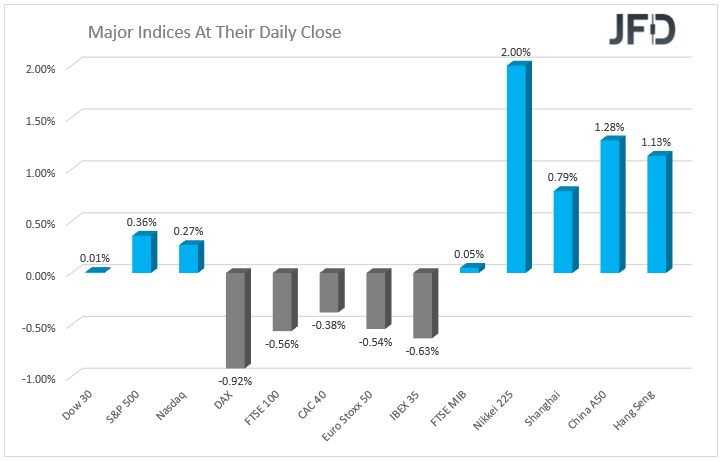 During the early hours of the European morning yesterday, there was news regarding Brexit, and specifically the Irish backstop again. Yesterday, we saw the euro taking a hit against its major counterparts, due to a report from Bloomberg that the staff at ECB started considering a possible change in the Bank’s current inflation target of “below, but close to +2.0%”. During the Asian morning today, we saw the Asian stock indices rebounding strongly and making their way up again, after e few days of selling.