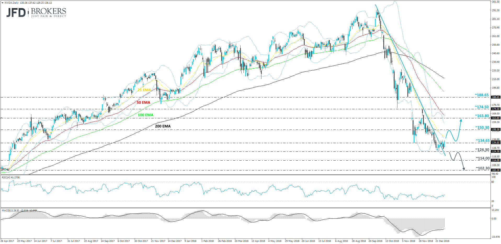 After a disastrous fourth quarter of 2018, Nvidia Corporation (NASDAQ: NVDA) was forced to close the year in the negative territory, well below the 2018 opening price at 194.35. In December, the stock managed to find good support near the 124.30-dollar price tag, from which it made a slight rebound. On the positive side, since that rebound, NVDA started trading sideways, which led to a break of a medium-term downside resistance line taken from the peak of the 2nd of October. This way, investors might get a chance to jump in and take advantage of the lower price and lift the stock a bit higher.