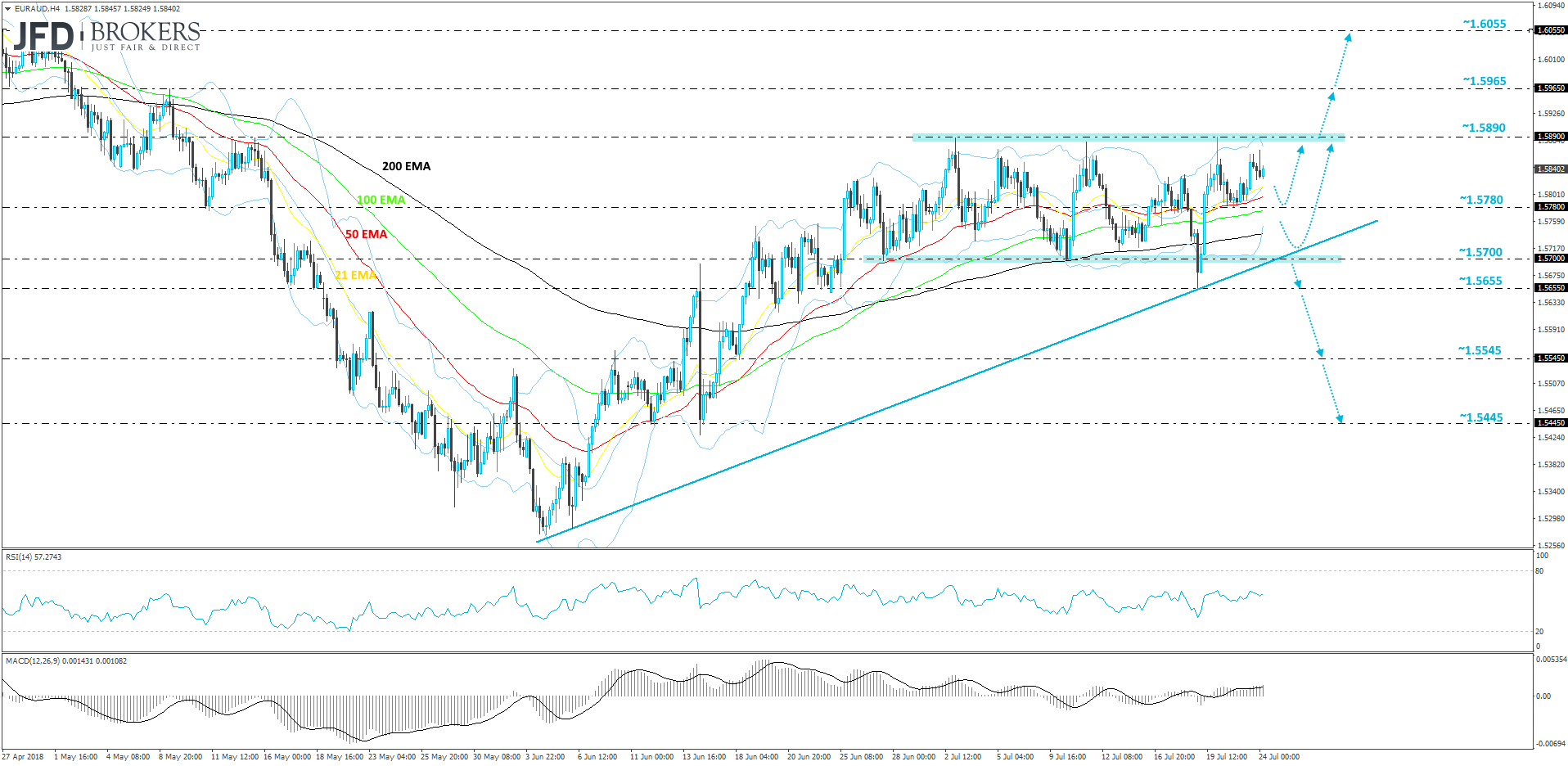 Alternatively, a move below the 1.5780 hurdle, could lead EU/AUD towards the lower side of the aforementioned range, at the 1.5700 mark. This is where the pair could meet the upside support line, taken from the 4th of June. The area could prove to be an important battleground for the bulls and the bears, as they could fight over the faith of EUR/AUD.