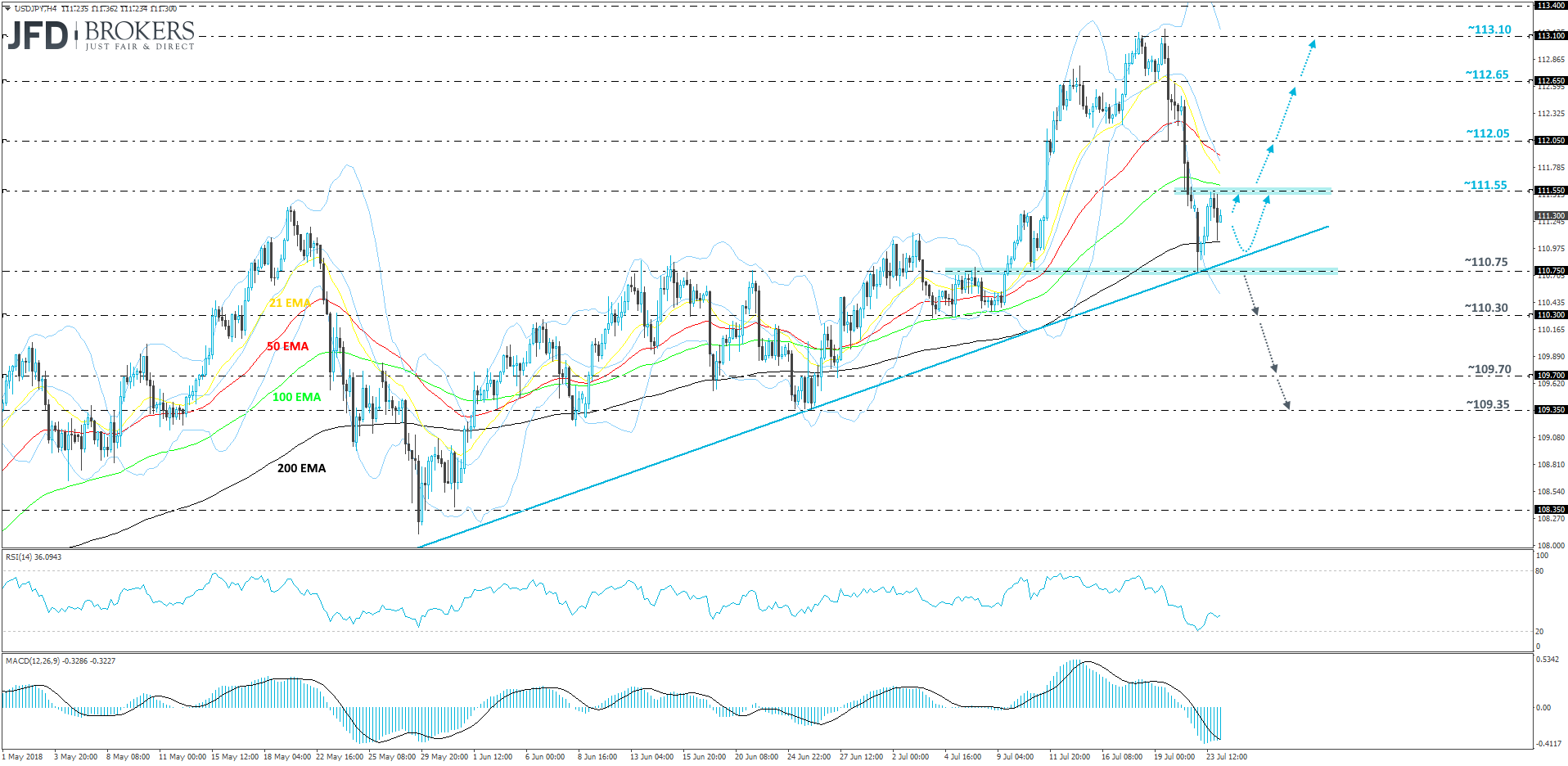 In case USD/JPY moves lower, for us to get comfortable with the downside scenario, we would need to see a strong move below the aforementioned upside support line and a good close below the 110.75 hurdle, marked by yesterday’s low. This is where we could start examining lower levels like the 110.30, which could act as an initial good area of support. A drop below could open the way towards the 109.70 barrier, or even the 109.35 zone, which held the rate strongly on the 25th and 26th of June from dropping further.