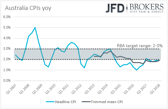 Tonight, during the Asian morning Wednesday, we get Australia's CPI data for Q2. Expectations are for the headline CPI rate to have entered the RBA’s 2-3% target band after staying slightly below the lower end for a year. Specifically, headline inflation is expected to have accelerated to +2.2% yoy from +1.9% in Q1. The trimmed mean CPI rate is expected to have remained unchanged at +1.9% yoy. If the forecasts are met, the headline rate would be above the RBA’s latest projection of 2%, but the trimmed rate would be just a tick below the Bank’s forecast for underlying inflation, which is also at 2%.