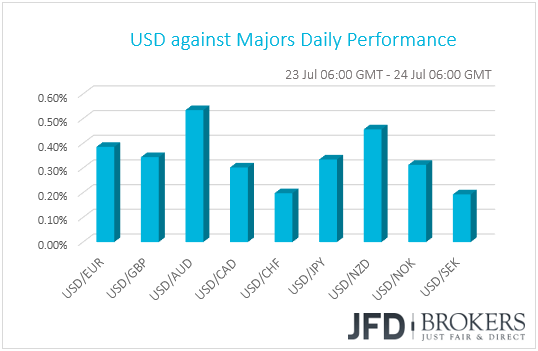 Besides Eurozone’s PMIs, we get preliminary manufacturing and services PMIs for July from the US as well. The manufacturing index is anticipated to have declined to 55.1 from 55.4, while the services index is expected to have remained unchanged at 56.5. In any case, we believe that the market tends to pay more attention to the ISM prints, due out on the 1st and 3rd of August.