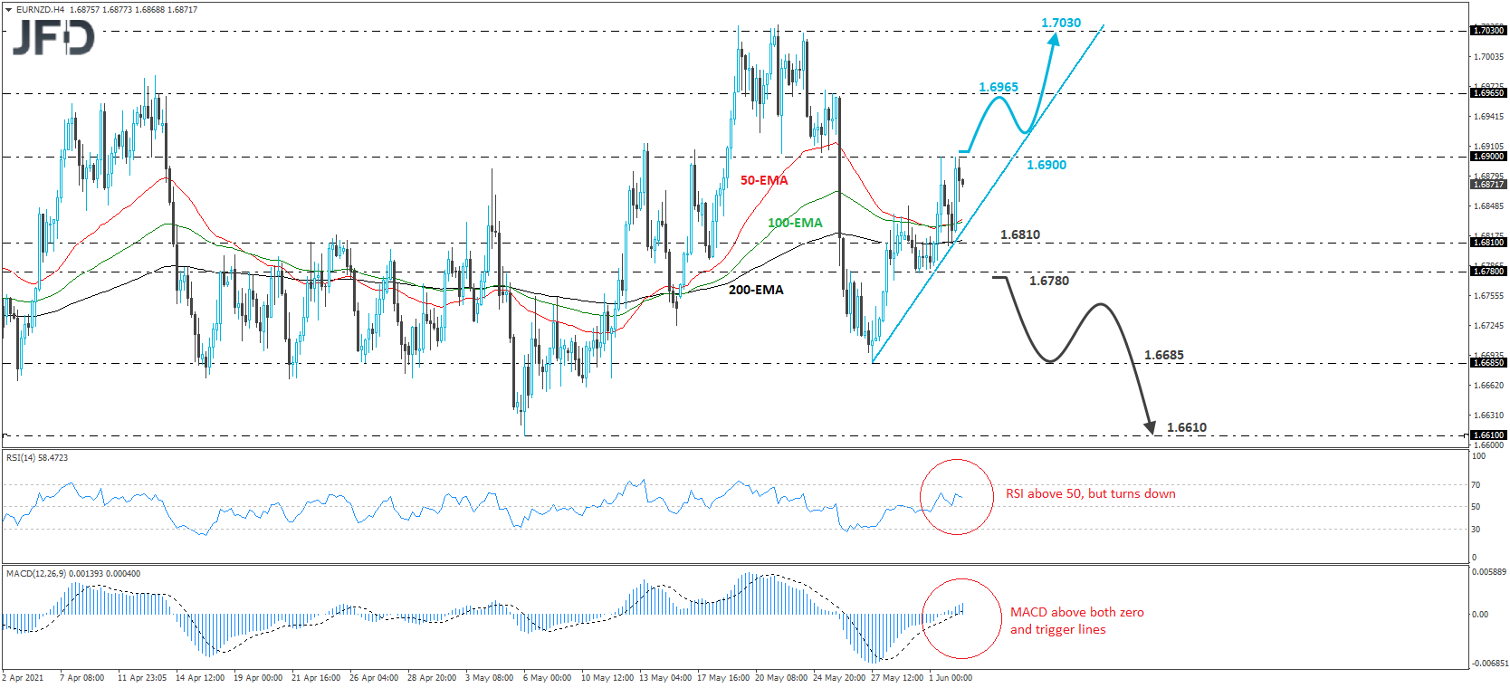 That said, in order to get confident on larger advances, we would like to see a clear break above the 1.6900 zone. Such a move would confirm a forthcoming higher high on the 4-hour chart and may pave the way towards the peak of May 26th, at around 1.6965. If that zone is not able to stop the bulls, then a break higher could see scope for extensions towards the 1.7030 zone, which provided strong resistance between May 19th and 24th.