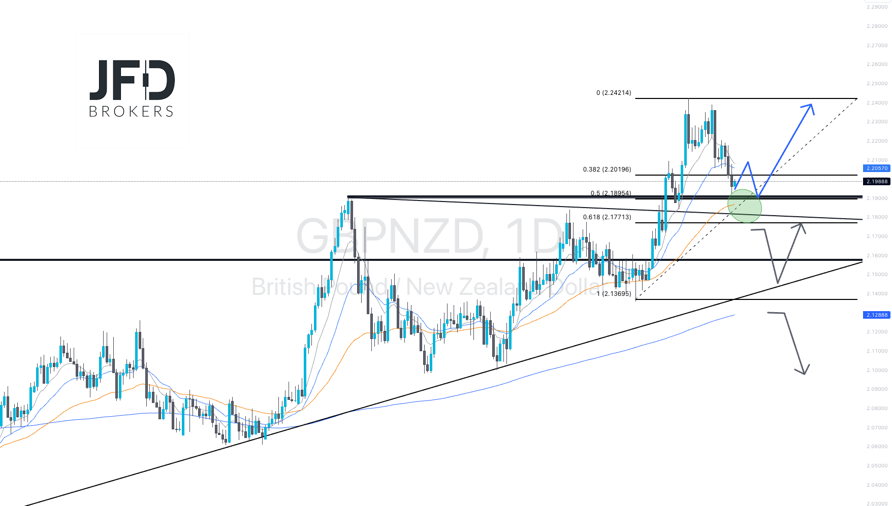 The currency pair GBPNZD has consolidated its rally movement in the last two weeks. From the high of 2.2421, the exchange rate returned to the breakout level of around 2.1900. This area has a significant support cluster consisting of horizontal support, a falling trend line, and a 61.8% Fibonacci retracement.