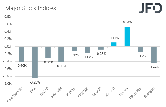 The weakening of the commodity-linked currencies Aussie and Kiwi, combined with the strengthening of the Swiss franc, suggests that investors may have stayed on the defensive. That said, although most EU bourses ended another session in negative territory, the US ones painted a different picture. Dow Jones slid only 0.08%, while both the S&P 500 and Nasdaq rose 0.12% and 0.54% respectively. Today, Asian markets were mixed, with Japan’s Nikkei225 and China’s Shanghai sliding 0.15% and 0.44% respectively.