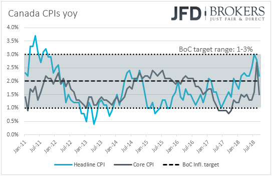 When they last met, Canadian policymakers remained willing to continue hiking rates if data continue to suggest so, but reiterated concerns over global trade tensions and the course of NAFTA negotiations. Since then, Canada and the US reached common ground over NAFTA, while data up until Friday were in support of a rate increase at today’s gathering. Nevertheless, on Friday, inflation data showed that the headline CPI rate dropped to +2.2% yoy from +2.8%, while the core rate slid to +1.5% yoy from 1.7%.