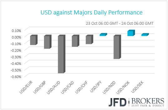 During the European morning, we get the preliminary manufacturing and services PMIs for October from several European nations and the Eurozone as a whole. Both the bloc’s manufacturing and services indices are expected to have declined, to 53.0 and 54.5 from 53.2 from 54.7 respectively, something that could drive the composite PMI down to 53.9 from 54.1. Even though, the services sector appeared to have stabilized somewhat in the second half of the year, manufacturing activity is set to experience its 10th consecutive slowdown.
