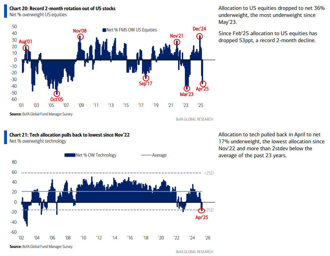 This year has seen retail investors pouring into equities, while fund managers have remained cautious on the sidelines. Despite the strong rebound in stocks, institutional players have yet to show signs of FOMO (fear of missing out). According to the latest Bank of America Fund Manager Survey, allocations to U.S. equities have dropped to their lowest levels since May 2023.