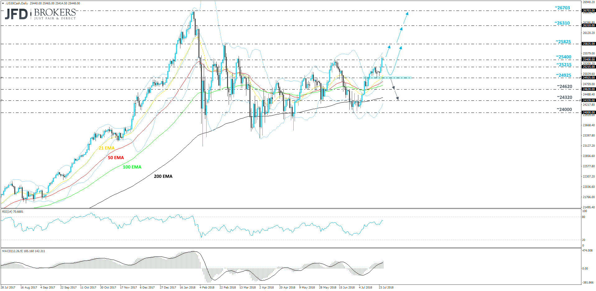 Yesterday, the index broke one of its key resistance levels, the 25400 barrier, which was last seen on the 11th of June. This move potentially opens the path to higher areas of resistance like the 25825 one, marked by the peak of the 26th of February. If this area is not able to withhold, the DJIA could then try and make its way towards the 26310 zone, or even back up to its all-time high at the 26703 level.