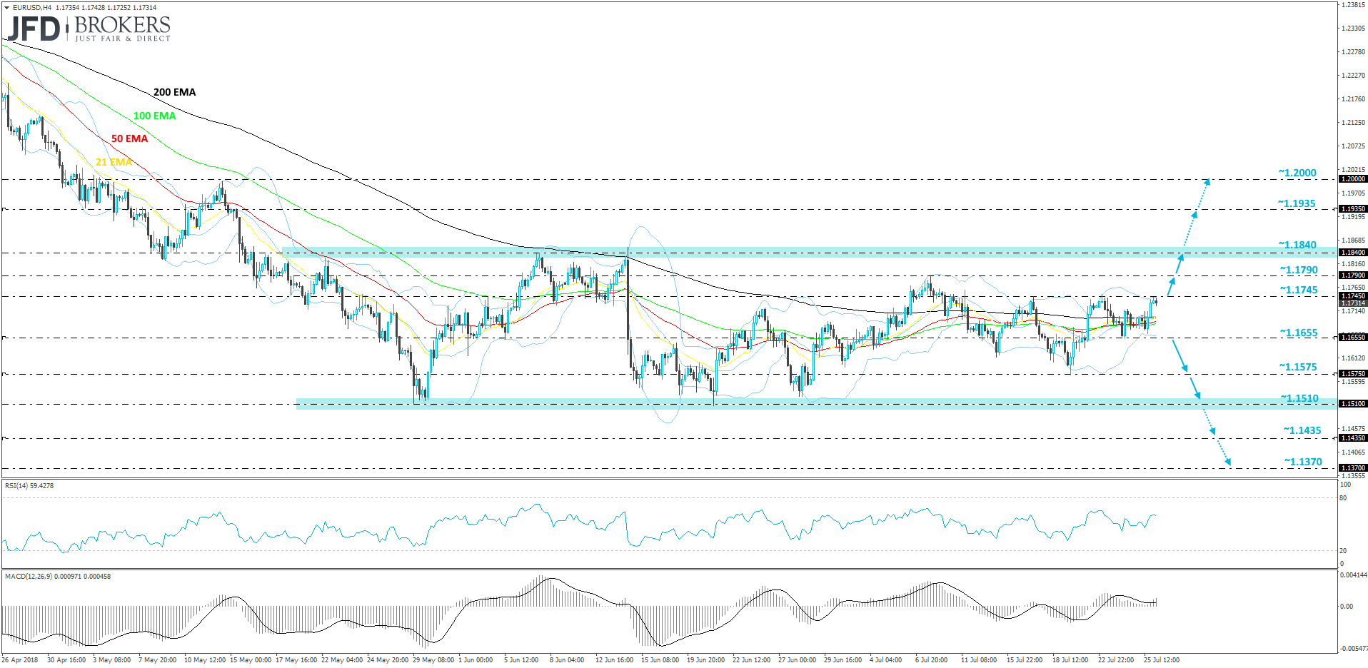 EUR/USD s currently sitting below a resistance line of 1.1745, which held the pair from moving higher on the 17th and 23rd of July. But if we see a break of it, then we could see the pair moving a bit higher towards its next area of resistance at the 1.1790 level. A break above could clear the path to 1.1840, which is acting as the upper bound of the aforementioned range. If EUR/USD finally decides to break that area, then this could be a signal for more bulls to join the buying action and drive the pair higher. The potential resistance zone to watch there could be the psychological 1.2000 barrier, marked by the high of the 14th of May.