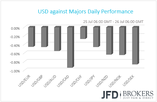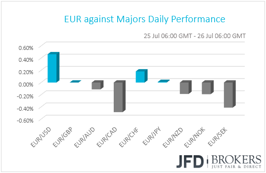 Yesterday, the main event for the financial community was the Trump-Juncker meeting in Washington. The dollar and the safe-havens CHF and JPY came under selling interest, while riskier assets, like commodity-linked currencies and equities, gained following a report citing a European official saying that President Donald Trump secured concessions from the EU to avoid a trade war. The report was confirmed soon thereafter when Trump and Juncker said they agreed to “work together towards zero tariffs, zero non-tariff barriers, and zero subsidies on non-auto industrial goods”.