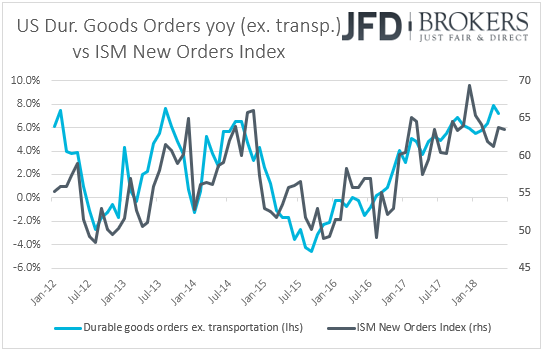 In the US, we get durable goods orders for June. Expectations are for headline orders to have risen 3.0% mom after falling 0.4% in May. However, something like that is likely to drive the yoy headline rate lower as the June 2017 monthly print that will drop out of the yearly calculation was 6.4%. As for orders excluding transportation, they are expected to have risen 0.5% mom after stagnating the previous month, which would drive the yoy up. Having said that though, bearing in mind that the New Orders sub-index of the ISM manufacturing PMI for June slid fractionally, to 63.5 from 63.7, we view the risks surrounding the core forecast as tilted somewhat to the downside.