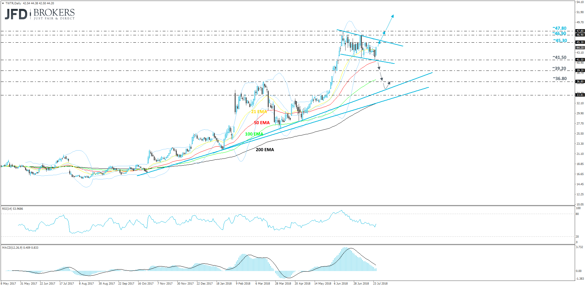 After a strong bullish daily candle that we have seen forming yesterday and the fact that investors believe that Twitter may not disappoint on the earnings release, there is a good chance that we could see the stock moving higher. If it tests again and eventually breaks the 45.30 resistance line, it could also break the upper side of the flag and head higher towards the 46.90 dollar zone, where more potential investors could jump into the action and try to drive the price towards the abovementioned 47.80 level, marked by the peak of the 15th of June. If that level is broken, then Twitter could be positioned for reaching new all-time highs.