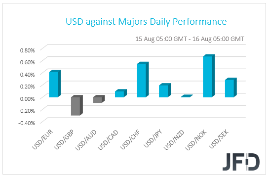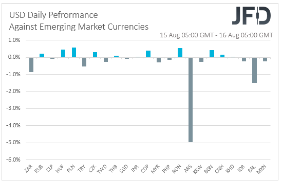 As mentioned above the US retail sales showed good results yesterday. The MoM figure for July was at +0.7%, where the initial expectation was only to be at around +0.3%. The retail sales excluding autos showed even better results, as it came out at +1.0% versus the forecasted +0.2%. This gave a good boost to the US dollar after the data got released, and the greenback managed to remain strong against its G10 counterparts (apart from the GBP and AUD). That said, USD struggled to keep its cool against some of the emerging market currencies, which showed good results yesterday after depreciating the day before.
