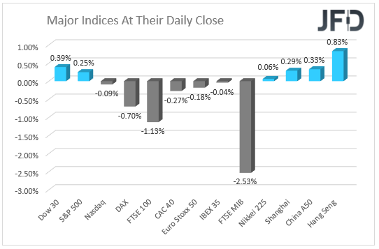 Yesterday, the European indices closed well in the red, most likely still driven by a sharp sell-off on Wednesday. The US equity markets had a mixed close. The Dow Jones Industrial Average and the S&P 500 manged to stay slightly in the positive territory, whereas the Nasdaq still ended the day fractionally in the red. The help for Dow and the S&P came the better-than-expected retail sales figures, but the US indices were still halted from moving higher by the industrial and manufacturing numbers on a MoM basis for July, which came out as a slight disappointment. Asian indices have gained today, where they managed to recover some of their losses made during the week. The Asian markets welcomed the news from China, which is believed to try and boost disposable incomes in the near term. But the markets still remain under pressure by the current geopolitical tensions, which could weigh in on them in a negative way at any point. The temporary delay on certain Chinese goods could get removed very easily, causing bigger problems for the equity markets.