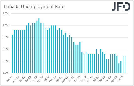 Finally, on Friday, apart from the negotiations in Washington between China and the US, investors are also likely to pay attention to Canada’s employment report for September. The unemployment rate is forecast to have remained unchanged at 5.7%, while the net change in employment is forecast to have slowed to 7.5k from 81.1k. At its latest meeting, the BoC kept interest rates unchanged at +1.75%, reiterating that the current degree of monetary policy stimulus remains appropriate and thereby, staying among the very few major central banks that have not turned their eyes to the cut button yet. That said, following the slowdown in both the headline and core CPIs for August, a soft employment report may raise speculation that this central bank could soon join the easing chorus.
