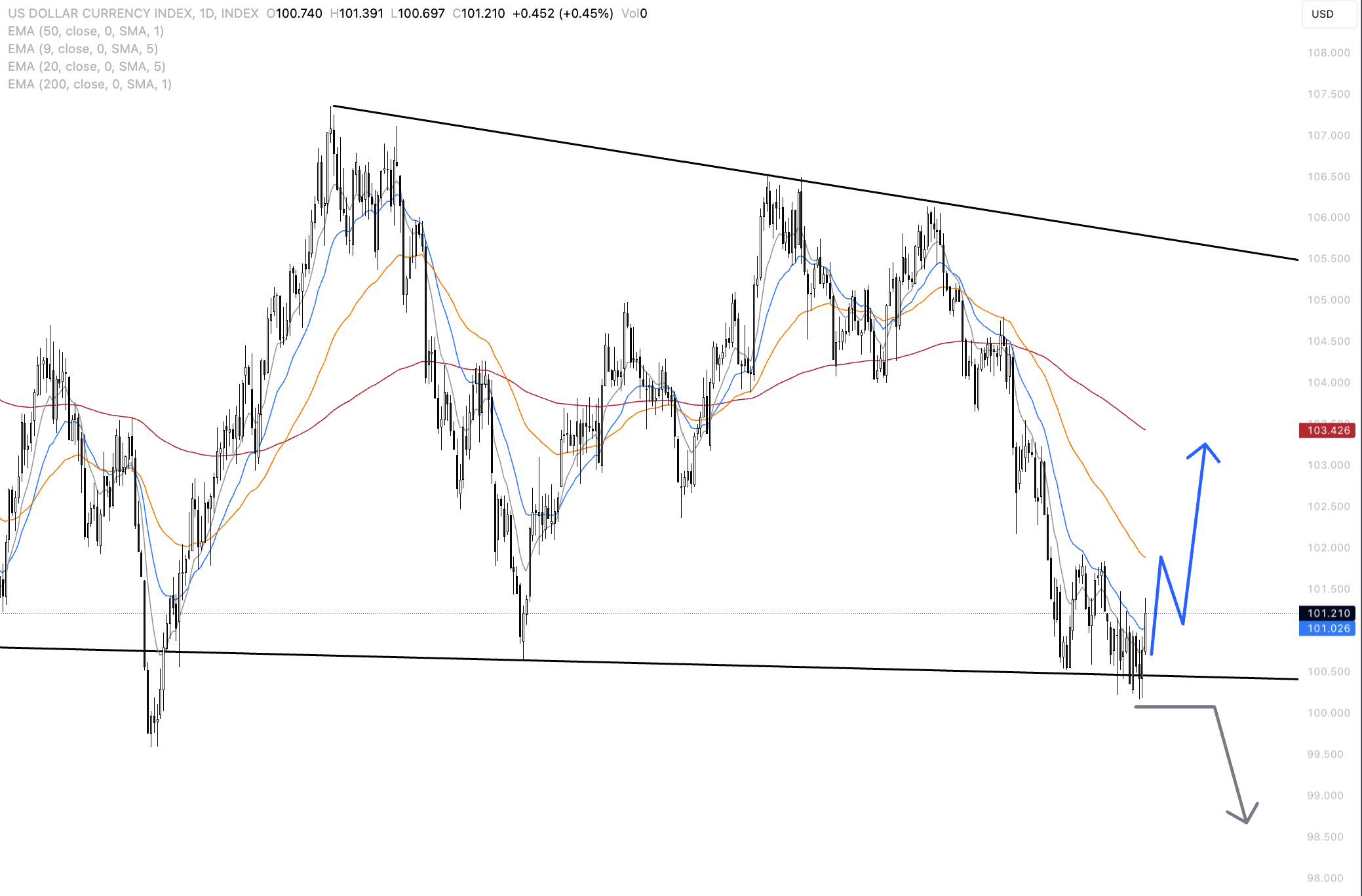 Our main scenario is another significant rebound of the USD to the north, which could take the index to 103,500 in the short term. Beyond that, we expect that in the bullish best-case scenario, a run at 105,500 is possible. This is where the falling trend line of the last few highs runs.