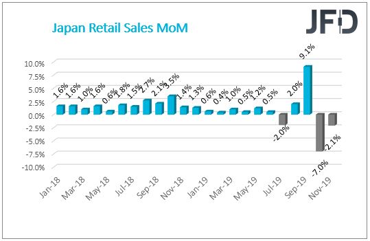 During the Asian morning today, we got some of the Japanese economic indicator readings. The consumer confidence had declined slightly from 100.9 to 100.4, while the Tokyo core and headline CPIs on a YoY basis for the month of December have improved a bit. The core has gone from +0.6% to +0.8% and the headline climbed from +0.8% to +0.9%. The MoM preliminary industrial production figure for November came out -0.9%, which is way better than the previous -4.5%. Before the release, the forecast was already quite optimistic, at -1.4%, but the actual data managed to beat even that. That said, although it is quite a significant rise, still, the number is in the negative territory. The Japanese unemployment is showing healthy signs, as the figure dropped to 2.2% from the previous 2.4%. But the disappointment came from the YoY Japanese retail sales number for the month of November. The actual reading came out at -2.1%, which is much better than the previous -7.0%. But economists and analysts were hoping to see a slightly better number than that, at -1.7%.