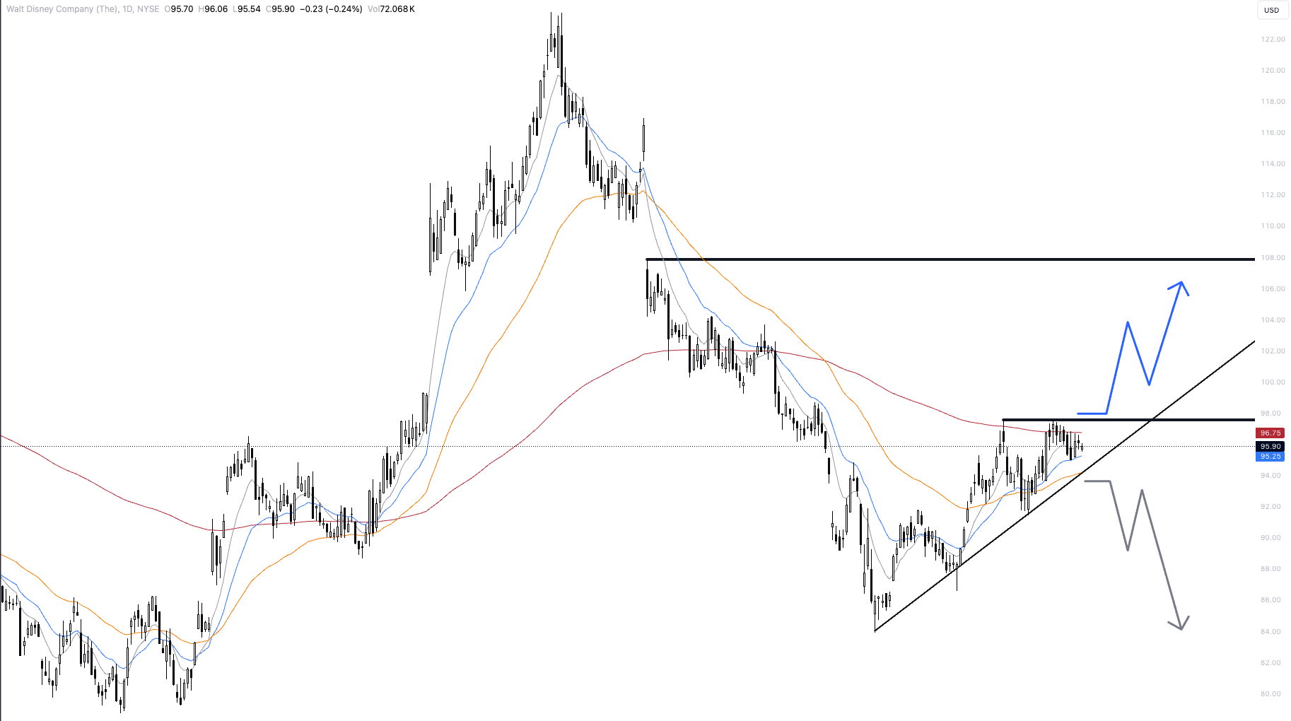 Our main scenario envisions a breakout on the upside. This would materialize with a rise above $98. If this is sustainable, the target price would be $108.