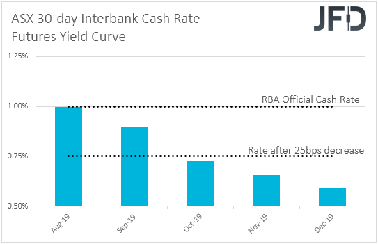 They added even more last week, after China allowed the yuan to fall past the 7.00 per dollar mark. According to the Fed funds futures, another cut is now fully factored in for September, while a third one is priced in for October. There is also a 15% chance for a “double cut” at the September gathering. In our view, a decent set of inflation data may push that percentage down, but it is unlikely to change much the picture of what the market anticipates from the Fed beyond September. For that to change drastically, positive developments from the US-China trade front are needed, something we see unlikely for now.