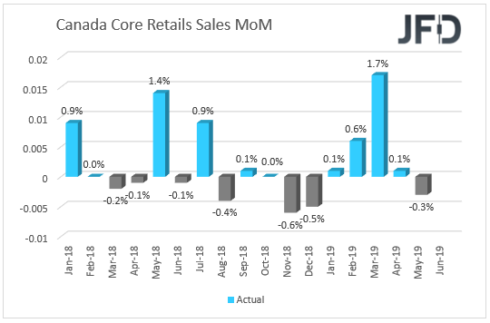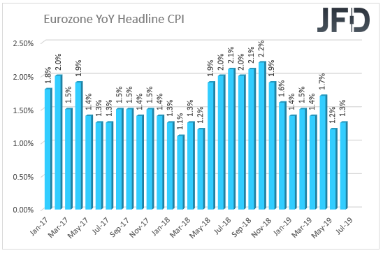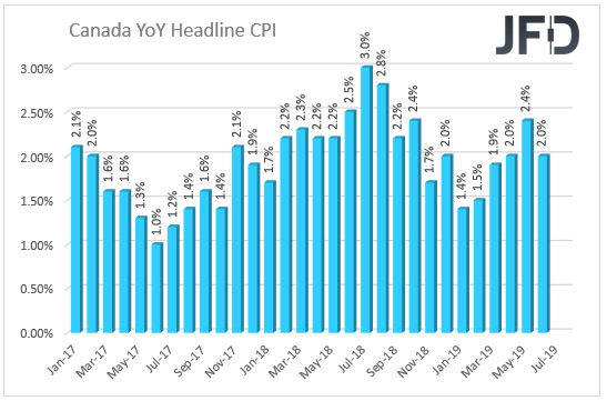 It will be Canada’s turn to provide us with its inflation numbers for the month of July. At the time of writing this report, there are no forecasts for the core MoM and YoY CPIs. The previous MoM and the YoY numbers were at +0.0% and +2.0% respectively. The headline MoM and YoY numbers are expected to show up slightly mixed. The MoM is believed to come out +0.1%, which is better than the previous -0.2%, whereas the YoY figure is forecasted to appear at +1.7%, which is below the previous reading of +2.0%. The core YoY number is in line with the Bank of Canada inflation target, at +2.0%, but the headline one still needs to pick up the pace, in order to get closer to the target. If the numbers come out as expected, or even a bit worse, this could have a slight negative effect on the Canadian dollar, especially against the US dollar.