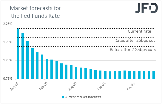 On Tuesday, during the Asian morning, we will get the Monetary Policy Meeting Minutes from the Reserve Bank of Australia. At that meeting, Australian policymakers kept interest rates unchanged at +1.00% and noted that they will continue to monitor developments in the labor market closely, and ease policy further if needed to support sustainable growth and achieve their inflation target. It is believed to be another 25 bps cut, bringing the rate from +1.00% to +0.75%. Last time the bank cut its rates in the beginning of July and it was the second cut this year. Although the Bank is quite happy with the domestic economy, the China-US trade disputes are weighing in the global economy, a slide in which could have a domino effect on Australia as well.