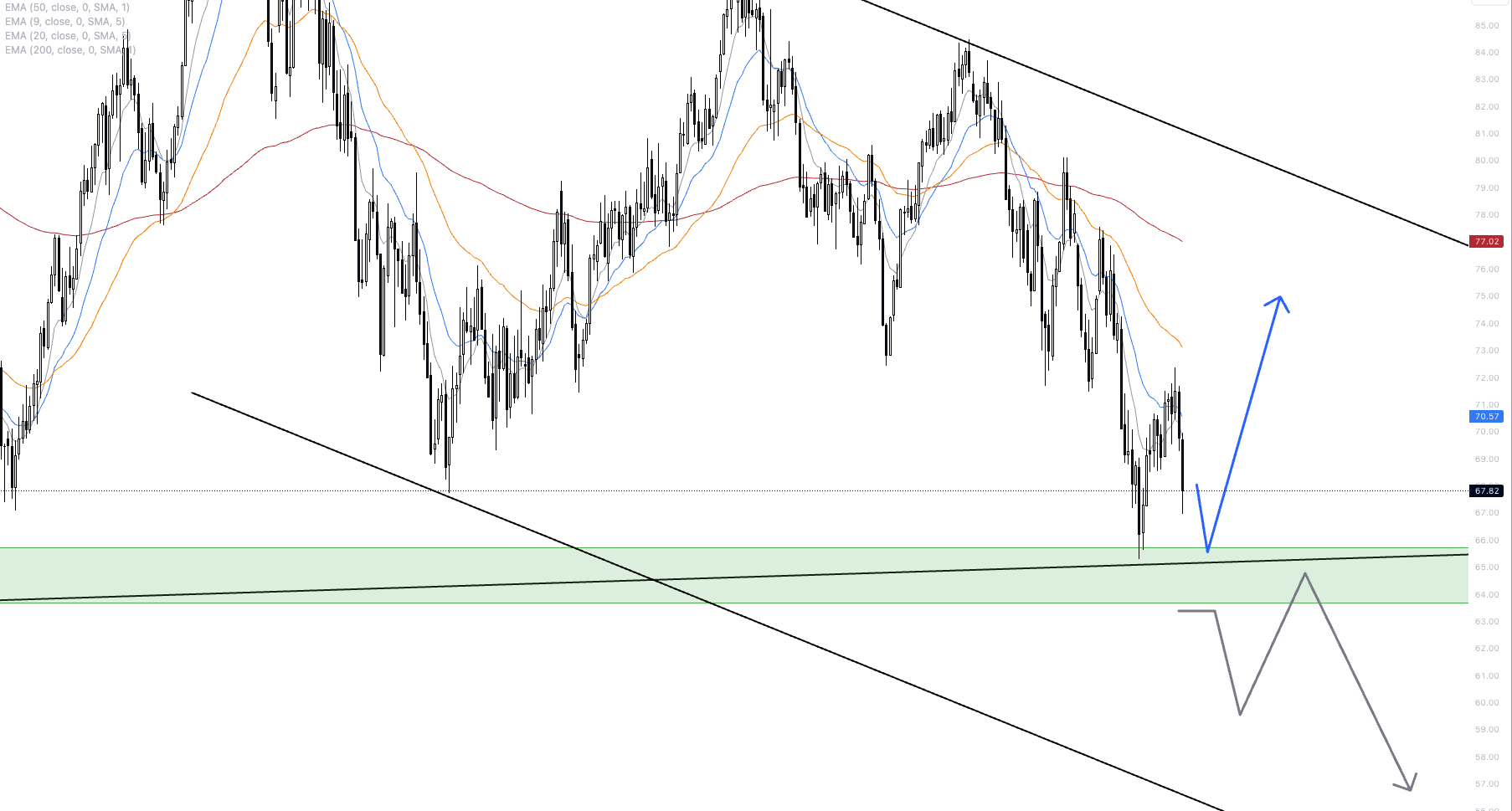 WTI oil is at a major decision zone. At USD 64-66, one of the most significant trend lines and horizontal support zones of the endless contract runs through.